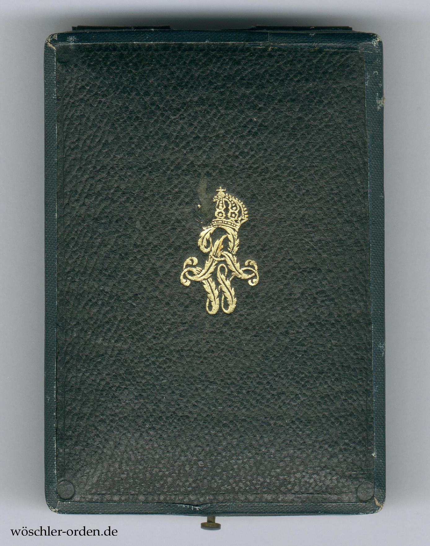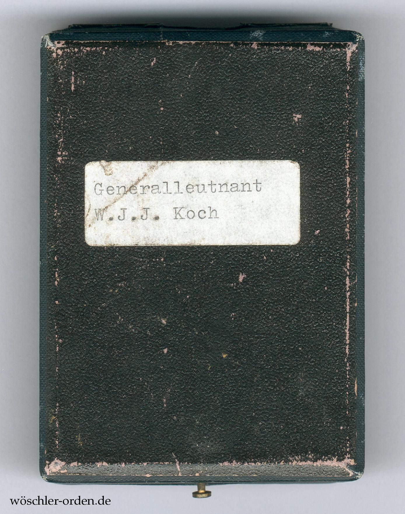 Dazu das Verleihungsetui aus später Fertigung der Firma H. F. Schwartz, Berlin, bezogen mit schwarzgrünem Ersatzmaterial mit goldgeprägtem, gekröntem Monogramm „WR“ auf dem Deckel, innen in weißer Seide und weinrotem Samt. Am Boden jüngeres Sammlungsetikett mit zweizeiliger Trägerangabe „Generalleutnant / W. J. J. Koch“ in Schreibmaschine.