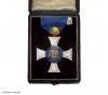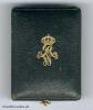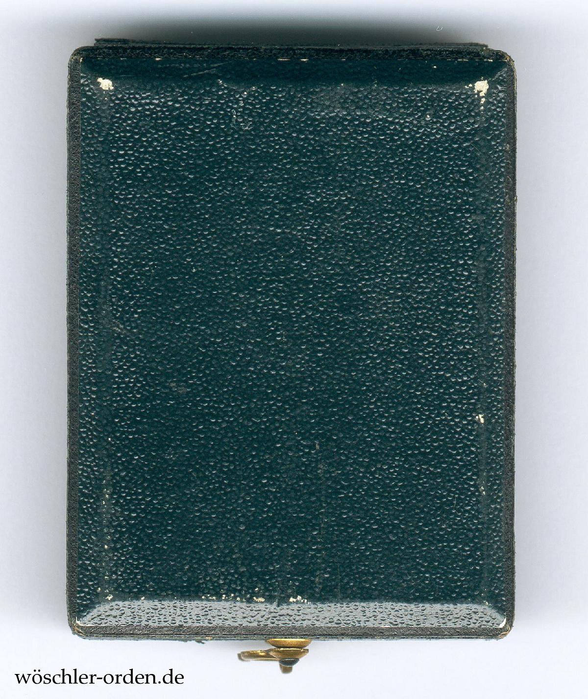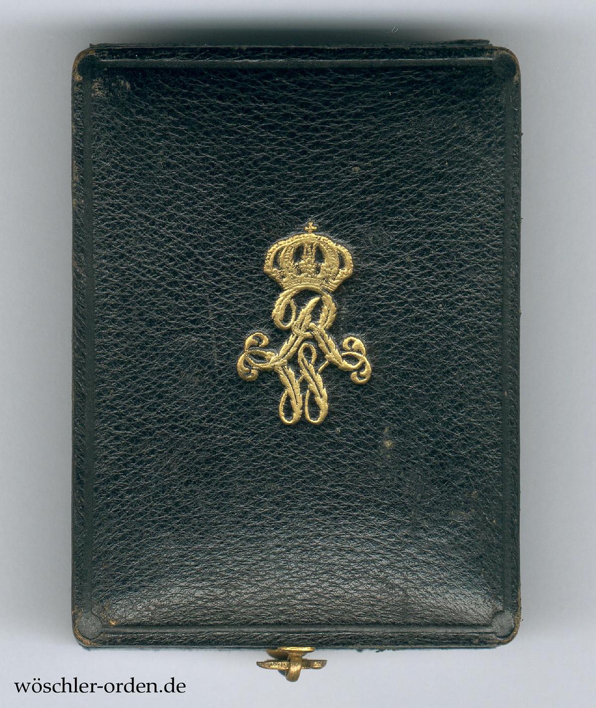 Dazu das Verleihungsetui in der älteren Fertigung mit Verschlusshaken, mit schwarzem Leder bezogen und mit gekrönter Initiale „WR“. Der Deckel innen in weißer Seide, die Einlage in weinrotem Samt und aufklappbar.