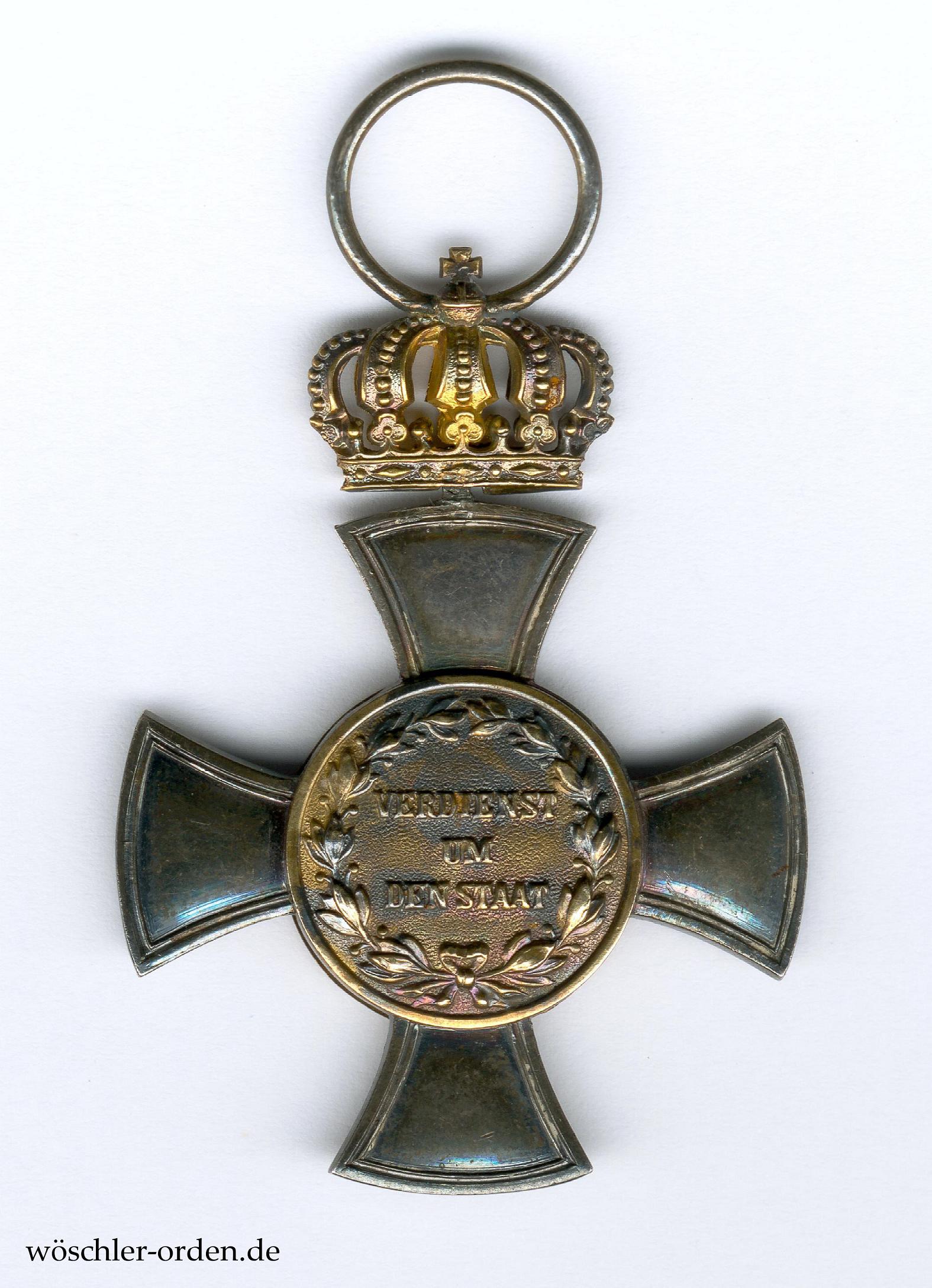 Silber geprägt, die Medaillons in Gold hohlgeprägt und verstiftet. Die „goldene Krone“ wohl in Doublé, beweglich befestigt und mit starrem Bandring. Im unteren Kreuzarm Ritzmarke „W“ für die Hofjuweliere Johann Wagner & Sohn, Berlin.
