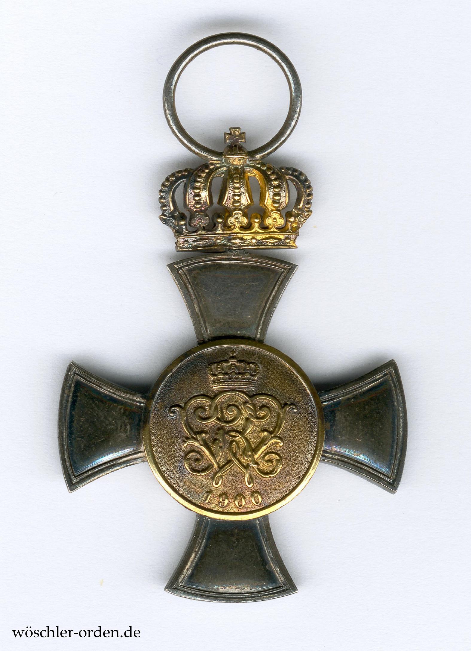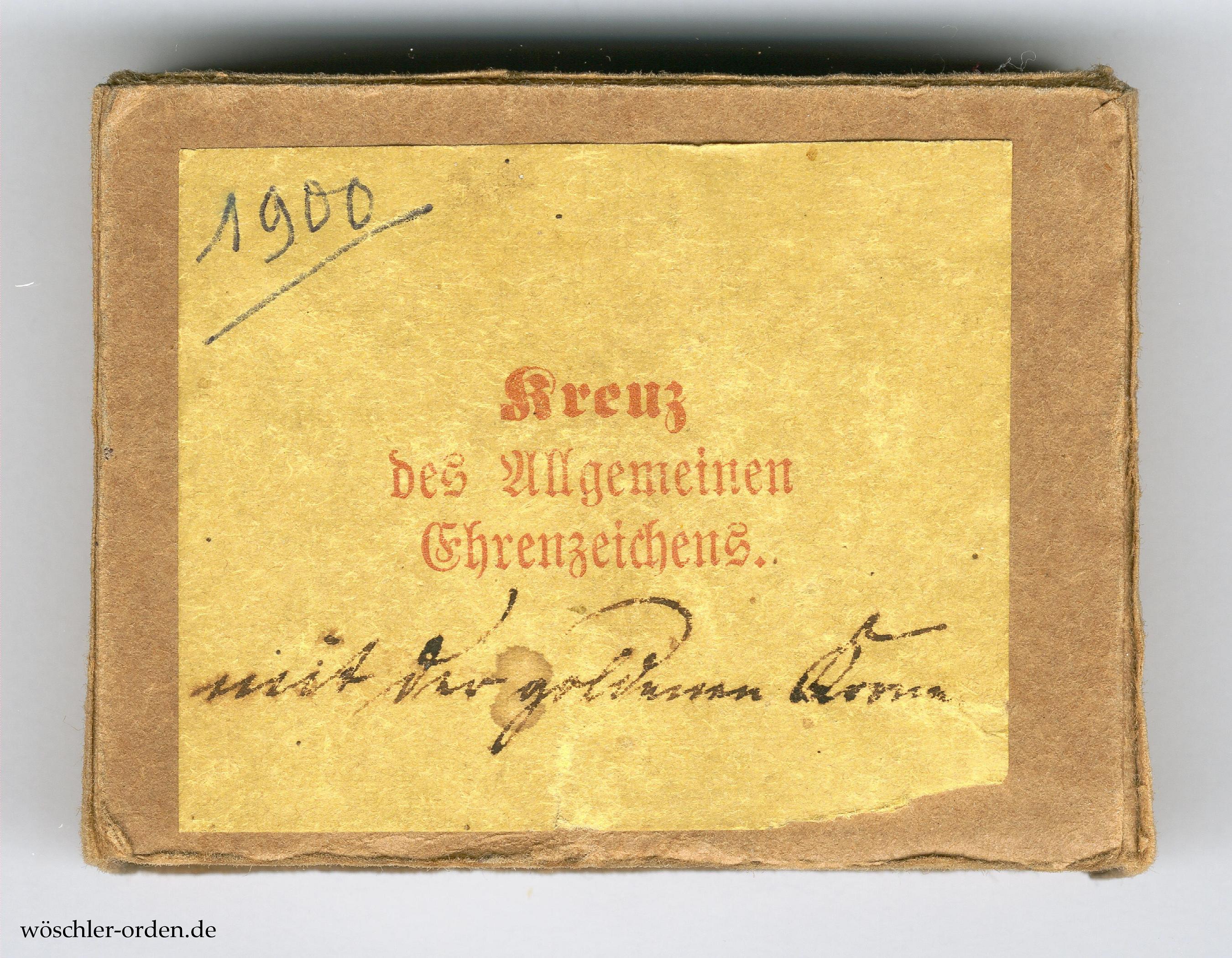 Das Kreuz des Allgemeinen Ehrenzeichens wurde am 27. Januar 1900 durch Wilhelm II. als höhere Stufe des Allgemeinen Ehrenzeichens gestiftet, nachdem zuvor das bereits 1890 gestiftete Allgemeine Ehrenzeichen in Gold – wohl aus Kostengründen – abgeschafft wurde. Verliehen werden konnte es mit den Jubiläumszahlen 50 und 60 sowie mit einer „goldenen Krone“, dies auch kombiniert. In der hier vorliegenden Form erfolgten nach Ludvigsen bis 1913 – mit den üblichen Einschränkungen – insgesamt 160 Verleihungen, hinzu kommen die fehlenden bis 1918.