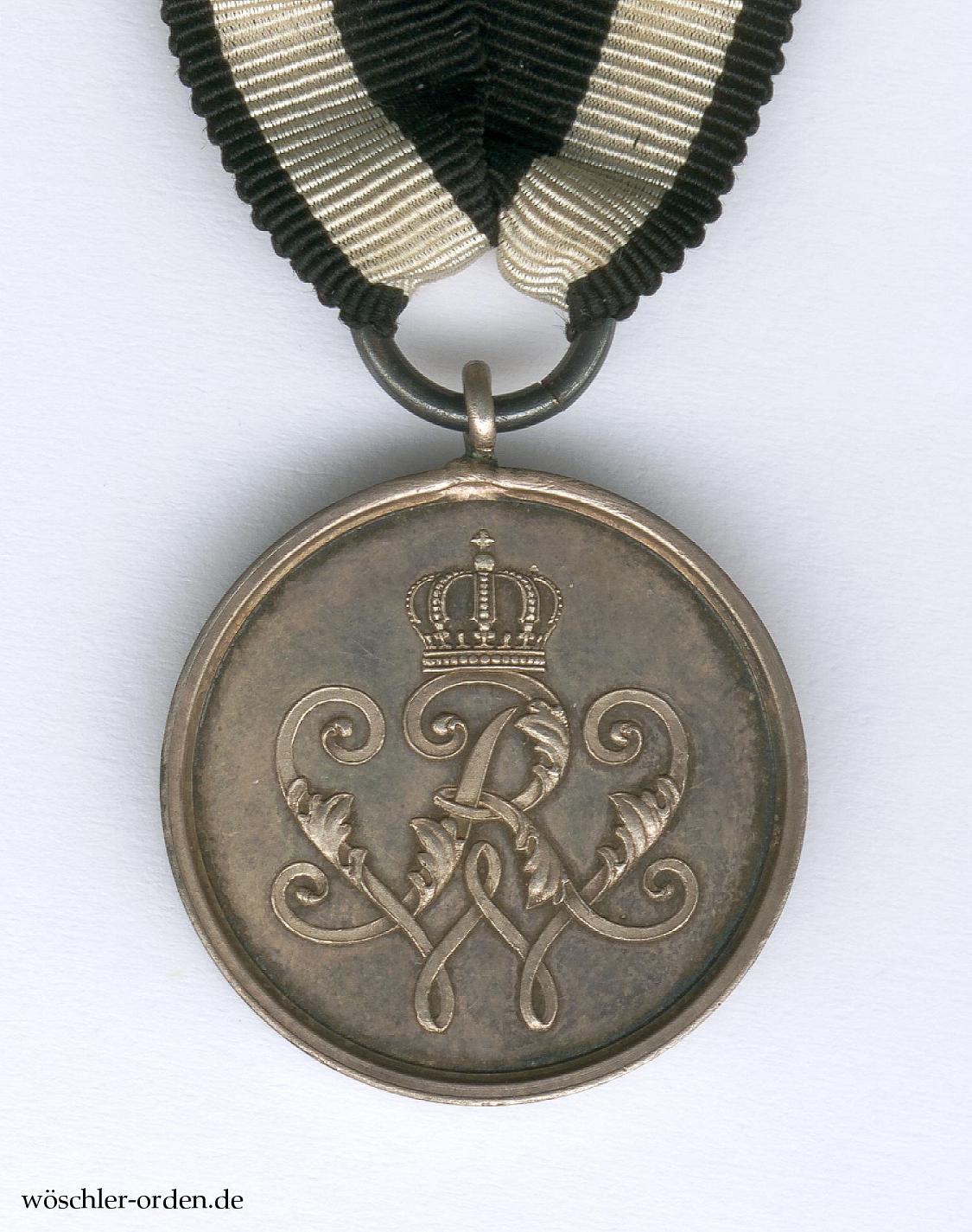 Probemäßiges Exemplar des zweiten, wohl ab etwa 1873 geprägten Modells mit dem Monogramm König Wilhelm I., wie es bis zum Ende der Monarchie und somit der Verleihungen 1918 vergeben wurde. Silber, an angelöteter Ringöse mit Bandring.