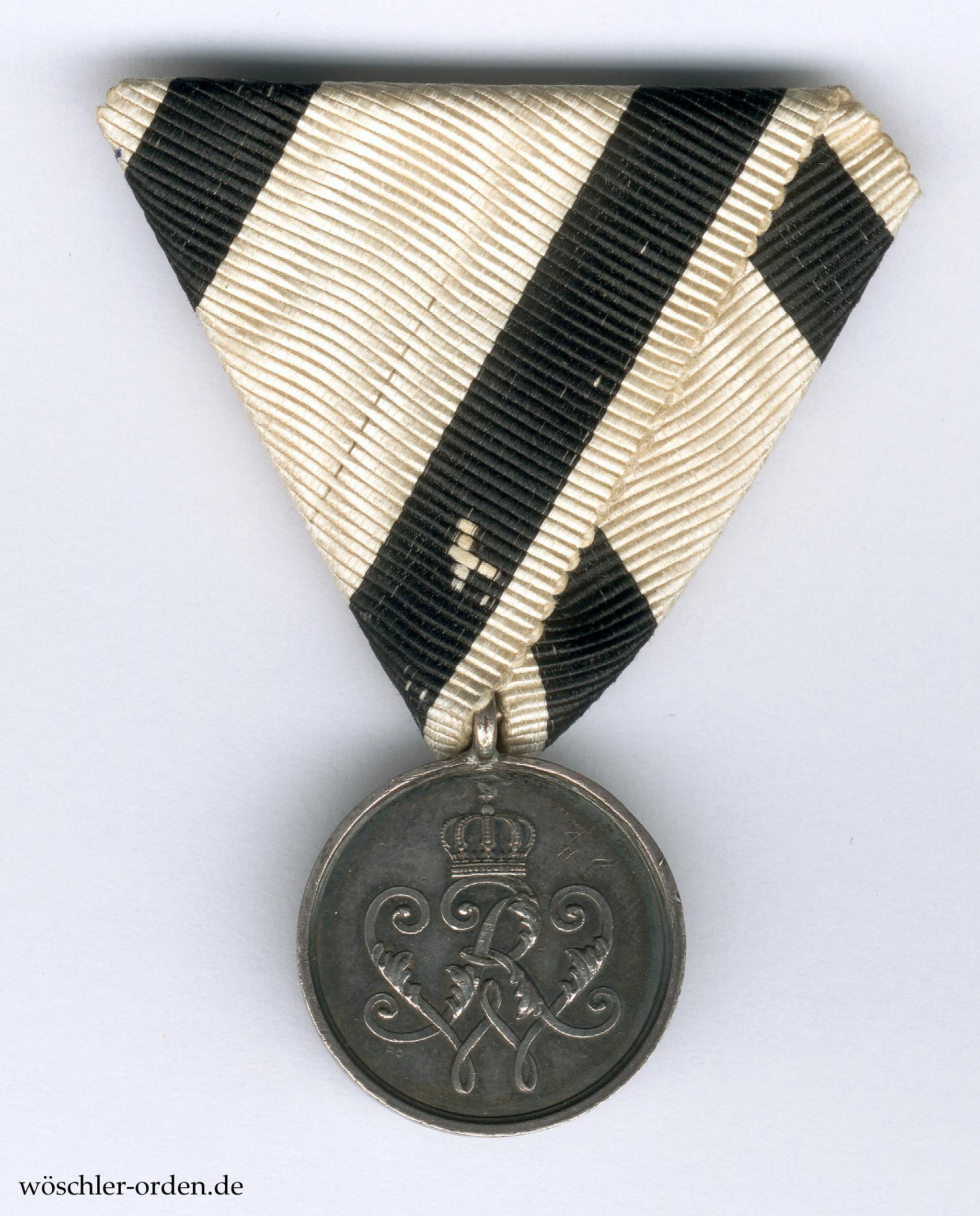 Probemäßiges Exemplar des zweiten, wohl ab etwa 1873 geprägten Modells mit dem Monogramm König Wilhelm I., wie es bis zum Ende der Monarchie und somit der Verleihungen 1918 vergeben wurde. Silber, an angelöteter Ringöse mit Bandring.