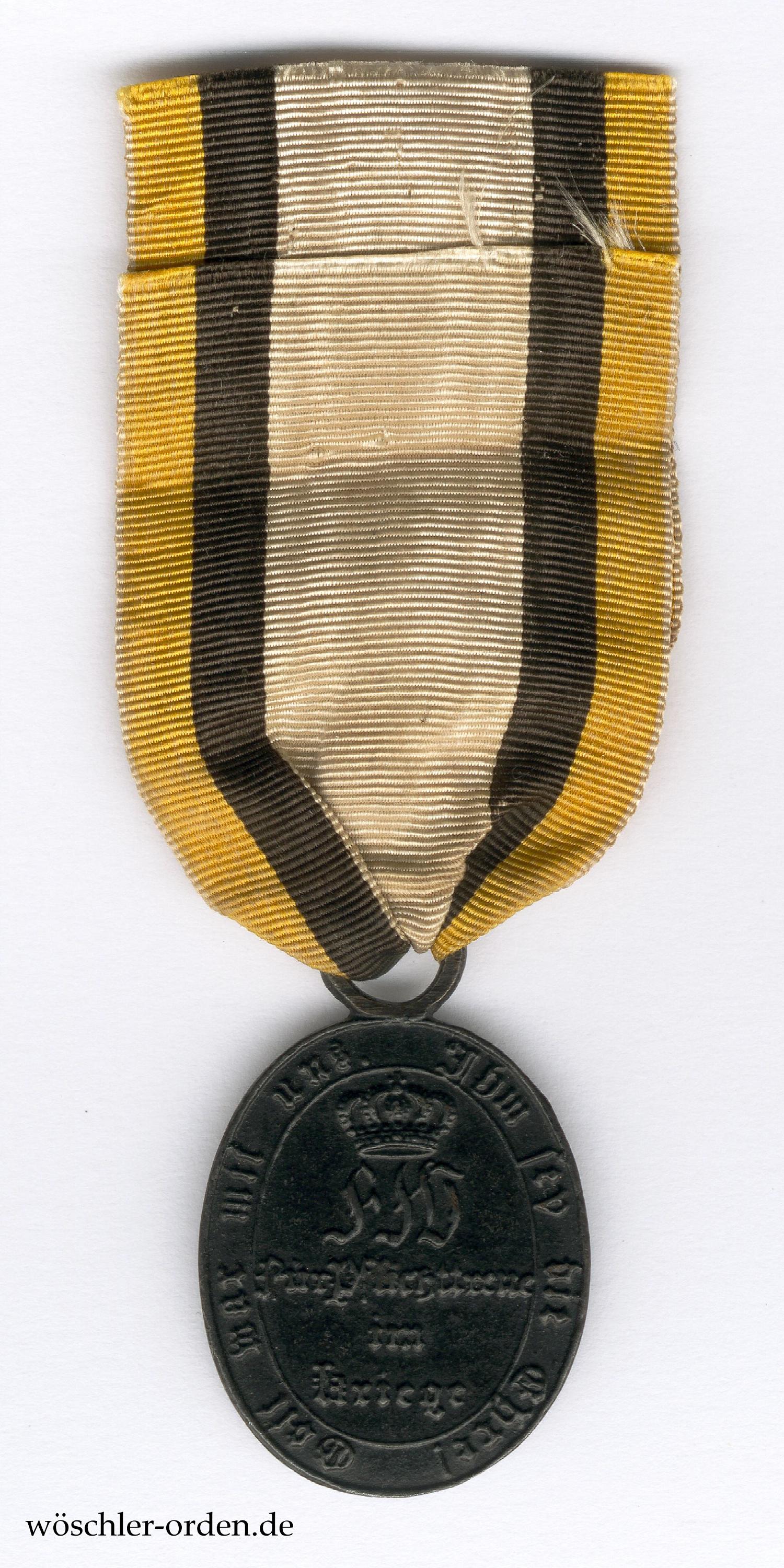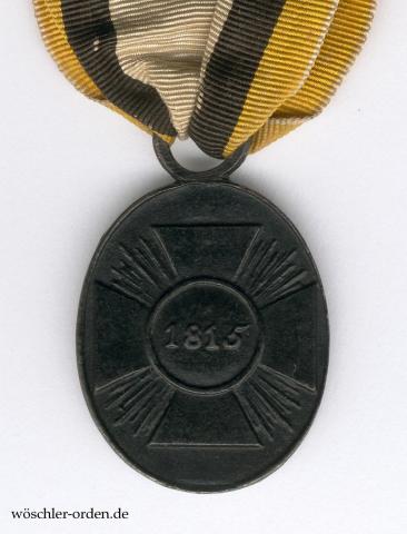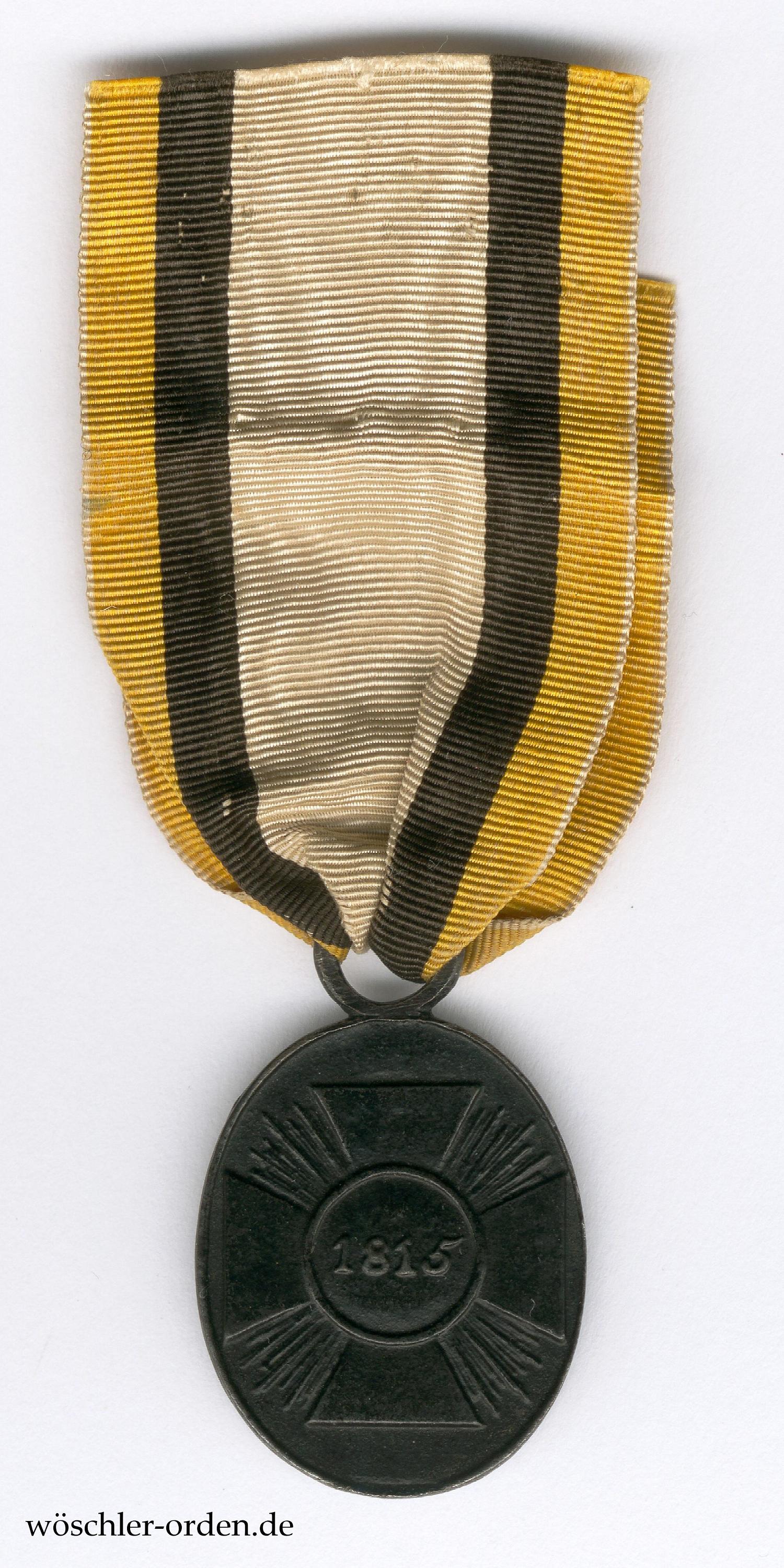Mit AKO vom 7. Januar 1815 stiftete Friedrich Wilhelm III. eine Kriegsdenkmünze, die anfangs für Militärbeamte und das Militärmedizinalwesen bestimmt war – eine Personengruppe, die in Summe etwa 8000 Mann ausmachte. Erste Medaillen wurden 1816 in der Berliner Eisengießerei gefertigt, im Lauf des Jahres 1816 wurde die Verleihung an diesen Personenkreis aufgenommen. Eine AKO vom 6. März 1817 erweiterte den Empfängerkreis auf Teile der kämpfenden Truppe. Die hierfür geschaffene zweite Medaillenserie wurde von 1817 bis 1820 in der Eisengießerei Gleiwitz gegossen, ihr Umfang beträgt mehr als das Zehnfache, insgesamt 88.360 Medaillen. Die zahlenmäßige Verteilung der Medaillen mit den Jahreszahlen 1813, 1814, 1813/1814 und 1815 scheint nicht bekannt zu sein, die Medaillen für 1815 sind jedoch die mit Abstand häufigsten, jedoch trotz der hoch erscheinenden Fertigungs- und Verleihungszahl heute nicht mehr häufig.