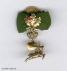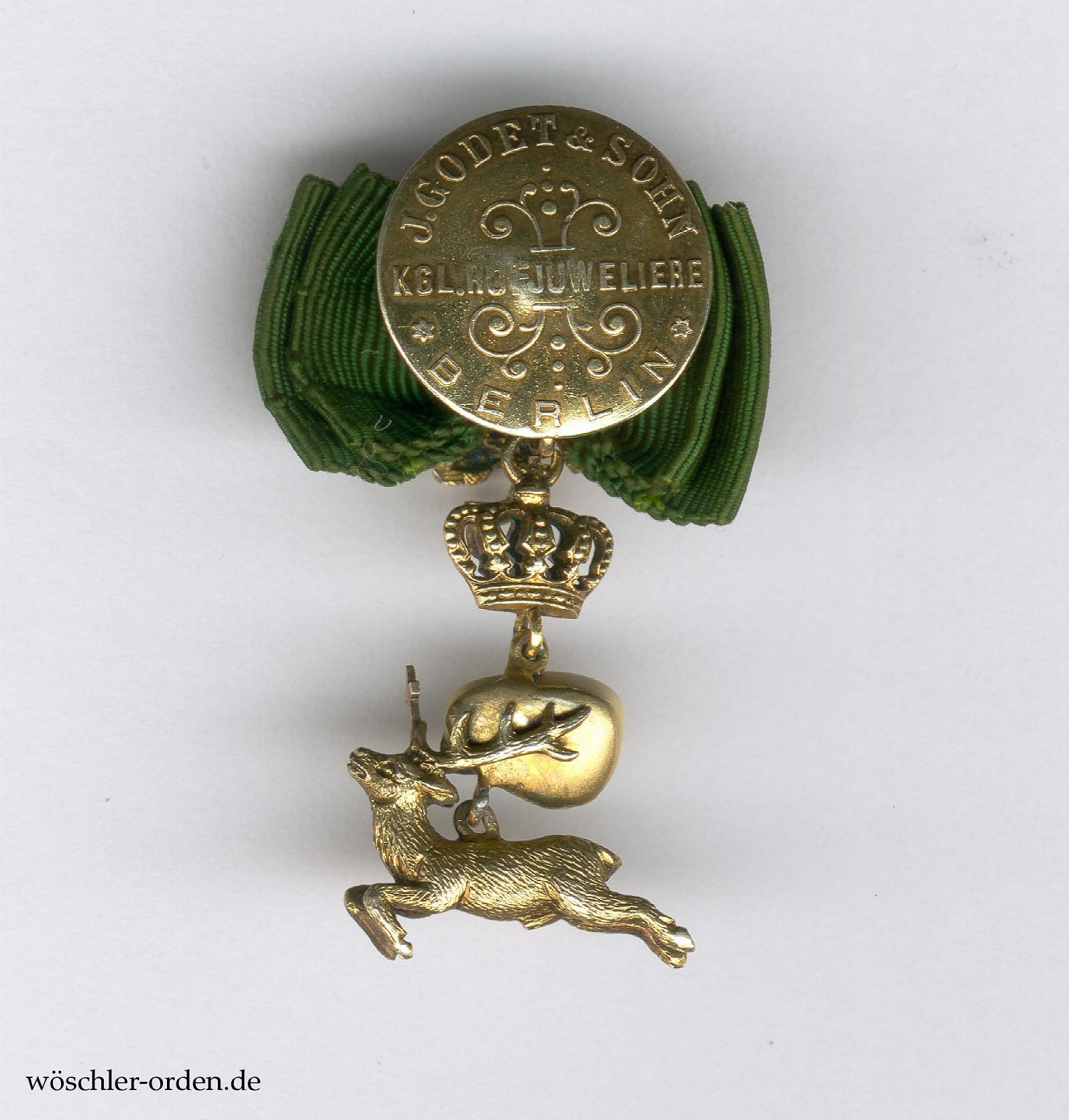 Silber vergoldet, mehrteilig gefertigt. Der Edelhirsch mit feinst nachgraviertem Fell und Stirnkreuz, beweglich an Hirschgrandl unter beidseitig gefertigter Königskrone hängend. An grüner Bandschleife mit aufgelegtem Eichenbruch mit kleinem Rubin. Rückseitig vergoldeter Trageknopf der Kgl. Hofjuweliere J. Godet & Sohn, Berlin.