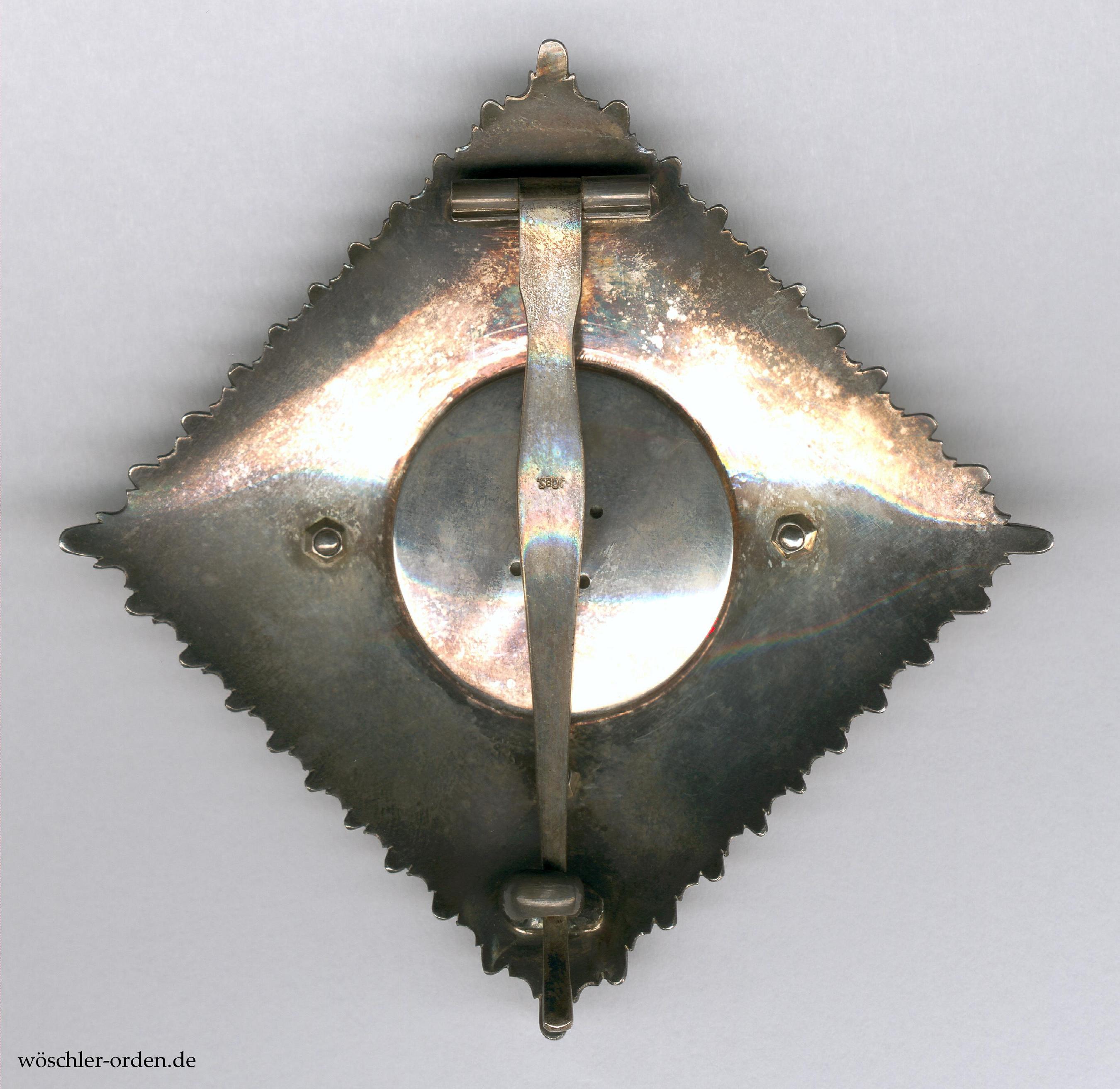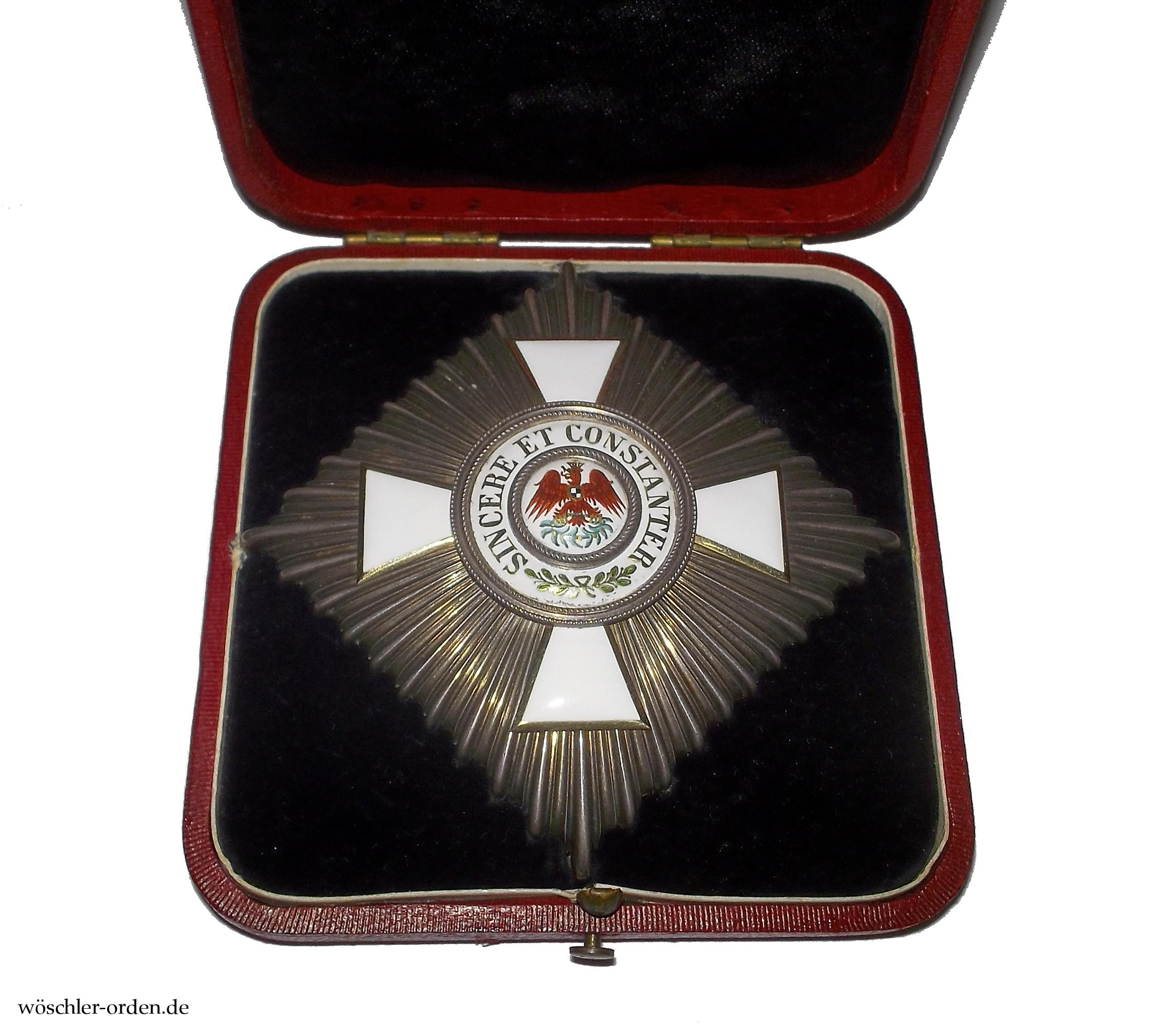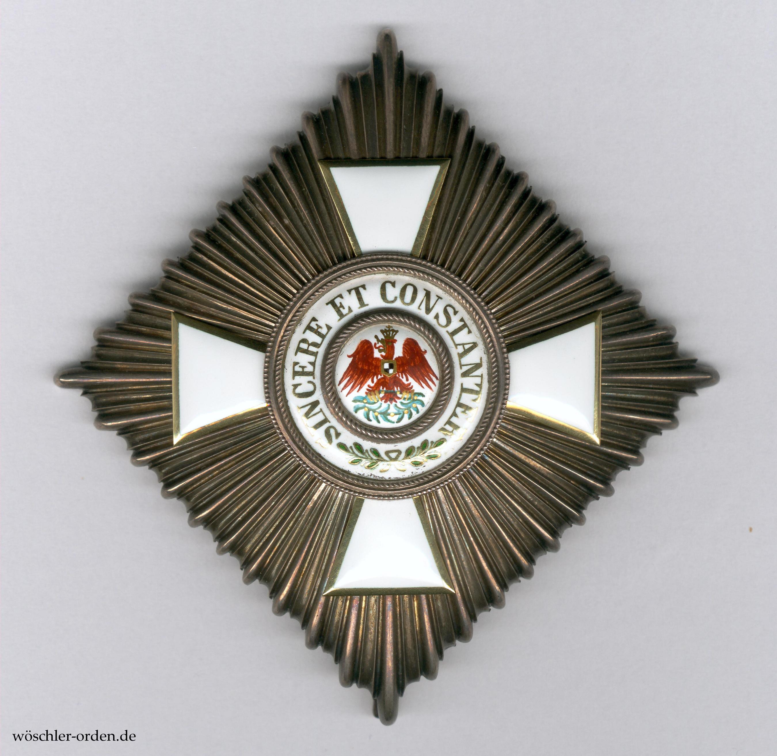 Exemplar des endgültigen, ab 1858 verliehenen Modells mit metallenem Korpus in der ersten, bis Ende 1916 gefertigten Ausgabe, in einer Fertigung wohl um 1900. Der Sternkorpus Silber, das Medaillon sowie die vier aufgeschraubten Kreuzarme in Gold und Emaille. Rückseitig mit vierfach gelochter Schraubplatte und bauchiger Tragenadel, diese mit Herstellerpunzierung „JG&S.“ der Hofjuweliere J. Godet & Sohn, Berlin, kopfstehend auf der Außenseite.