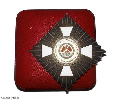 Der Stern in guter bis sehr guter, wohl kaum getragener und scheinbar völlig unbeschädigter Erhaltung, außerdem insgesamt mit einer feinen, leichten Patina. Das Etui nur stellenweise etwas bestoßen, in ebenfalls guter Gesamterhaltung.