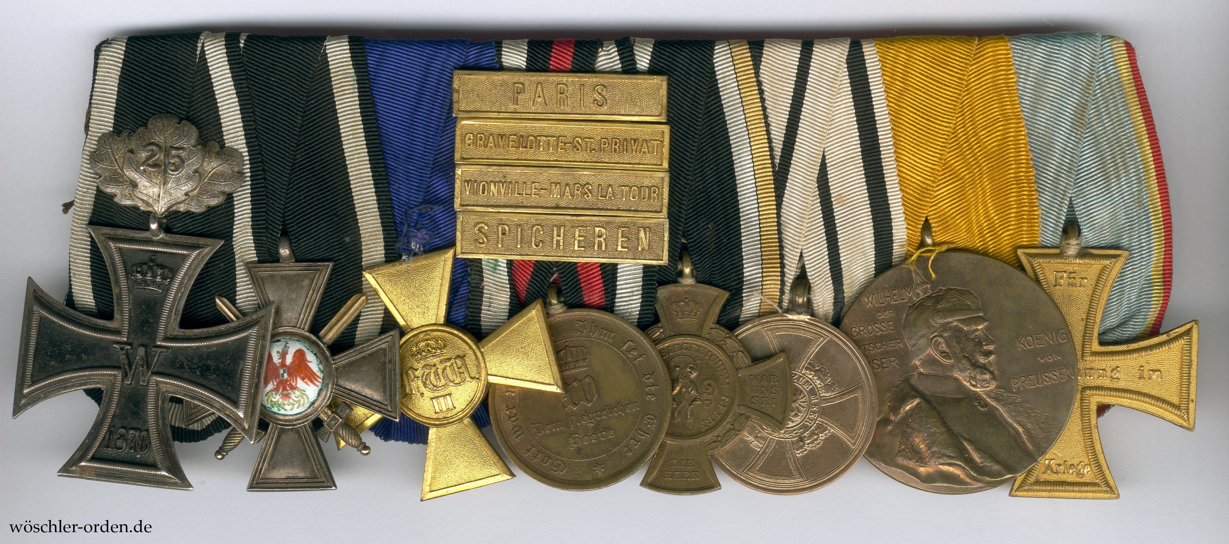 - Preußen, Kriegsdenkmünze 1870/71 in Bronze, mit vier Gefechtsspangen „SPICHEREN“, „VIONVILLE – MARS LA TOUR“, „GRAVELOTTE – ST. PRIVAT“ und „PARIS“;