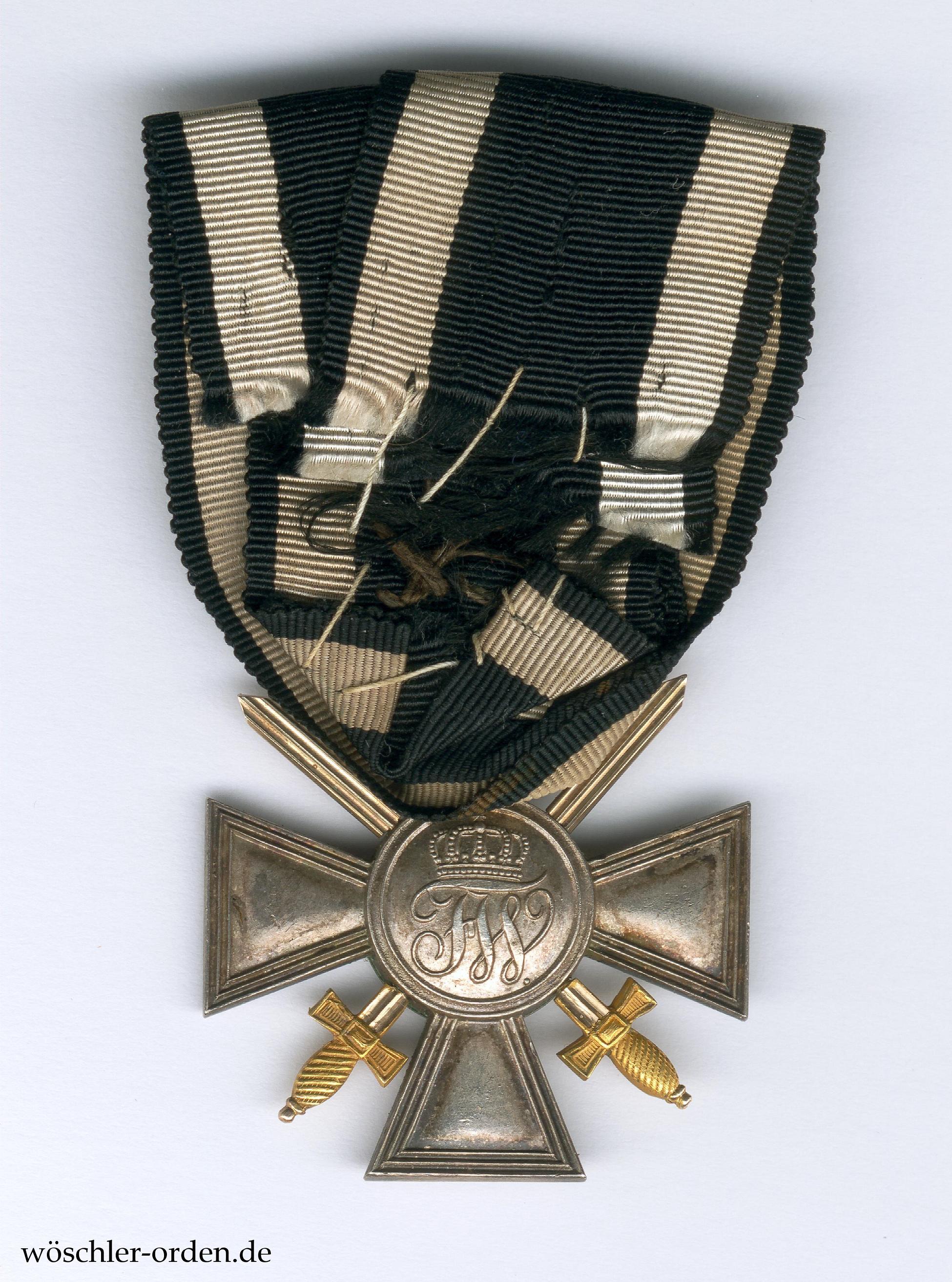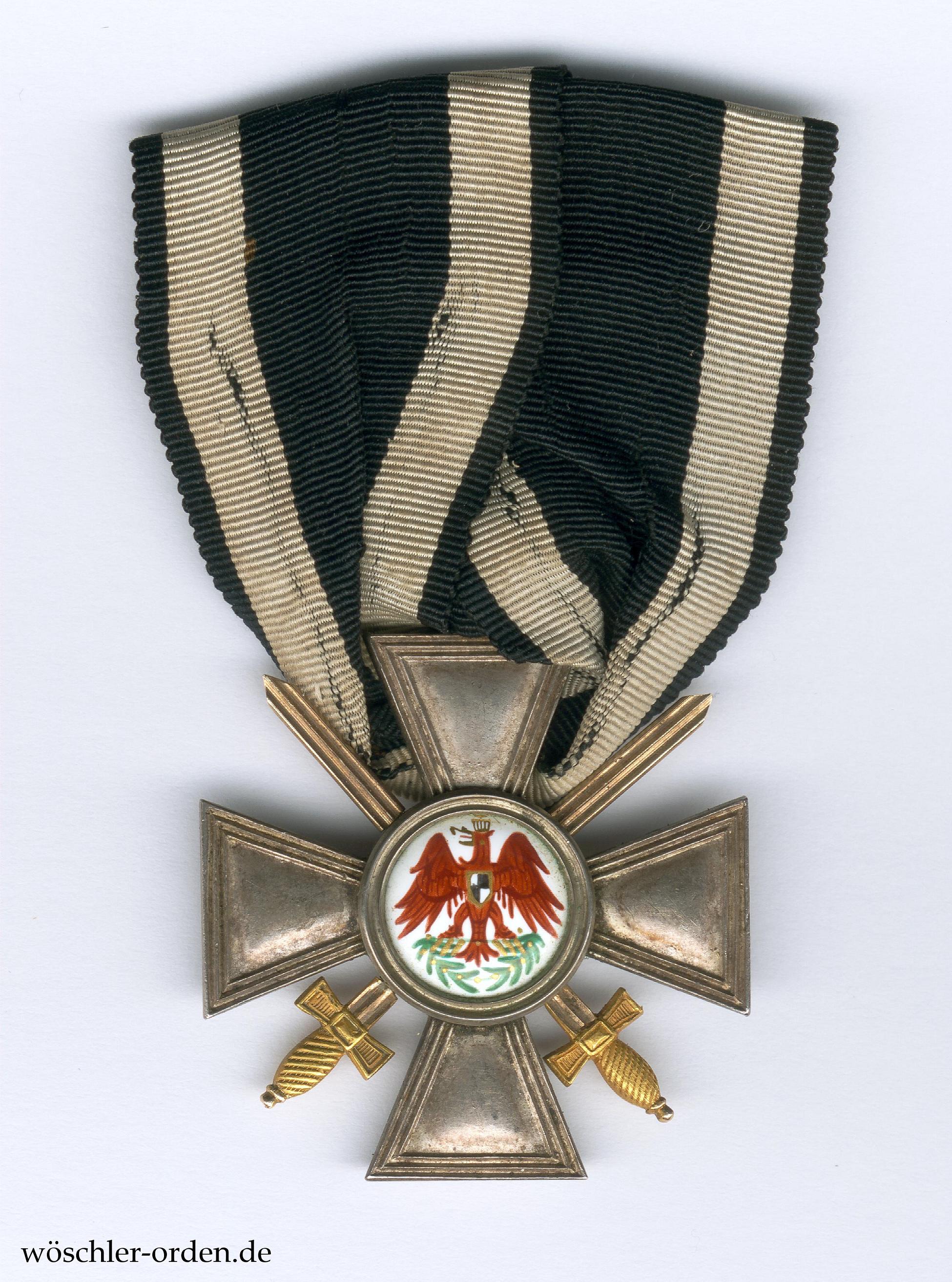 Exemplar aus der Zeit des fünften und endgültigen, ab 1854 verliehenen Modells mit dem ziegelroten Adler, in der ersten, bis 1885 verliehenen Ausgabe mit glatten Kreuzarmen. Silber, das Medaillon emailliert, die probemäßigen Schwerter massiv(!) geprägt und eingeschraubt, die Klingen in Rotgold, die Schwertgriffe in mattiertem Gelbgold. Ohne ersichtliche Herstellermarkierung.
