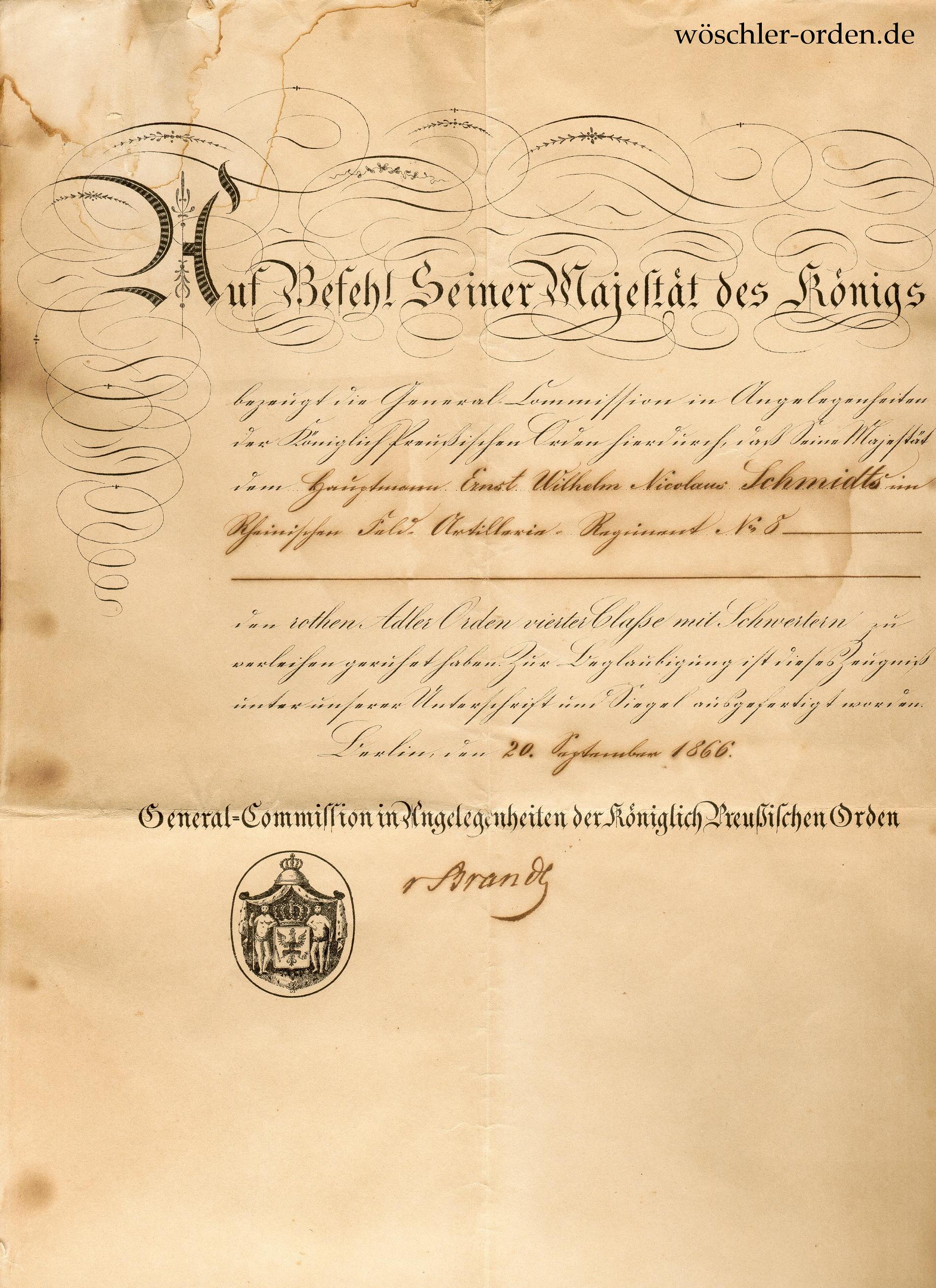 Dazu die Verleihungsurkunde für den Hauptmann Ernst Wilhelm Nicolaus Schmidts im Rheinischen Feld-Artillerie-Regiment No. 8 vom 20. September 1866, mit der Unterschrift des Präses der Generalordenskommission General der Infanterie v. Brandt. Doppelblatt, einseitig bedruckt und ausgefüllt, mit gedrucktem Siegel. Das Scannerbild des Urkunden-Formats (etwa 36,5 cm x 22 cm) wegen unvollständig. Unten links, nicht im Bild, die Vorgangsnummer „No. 2261.“
