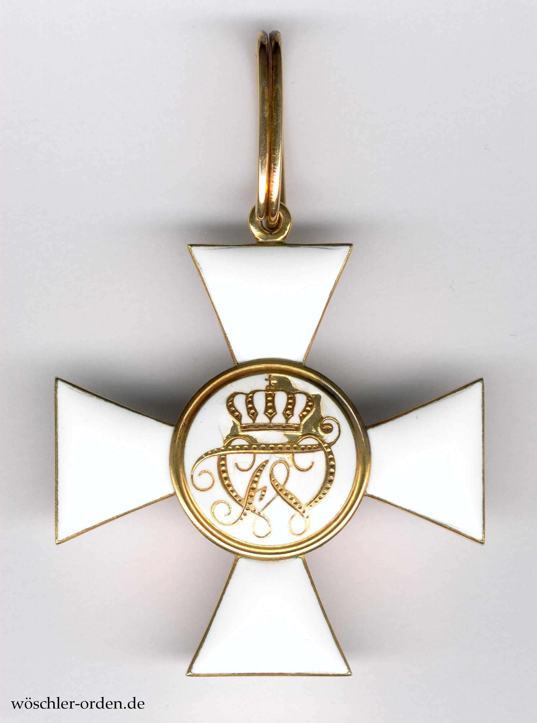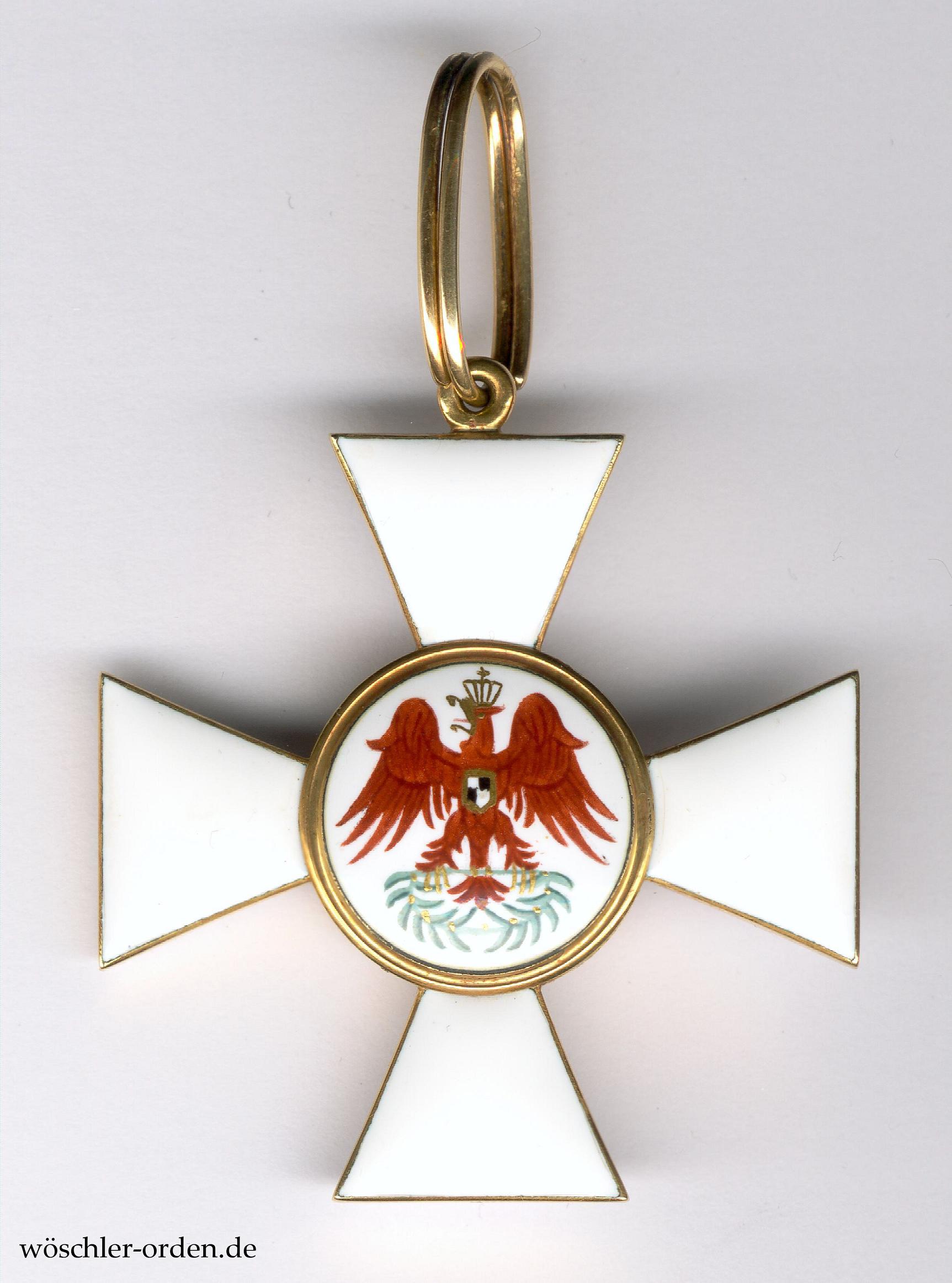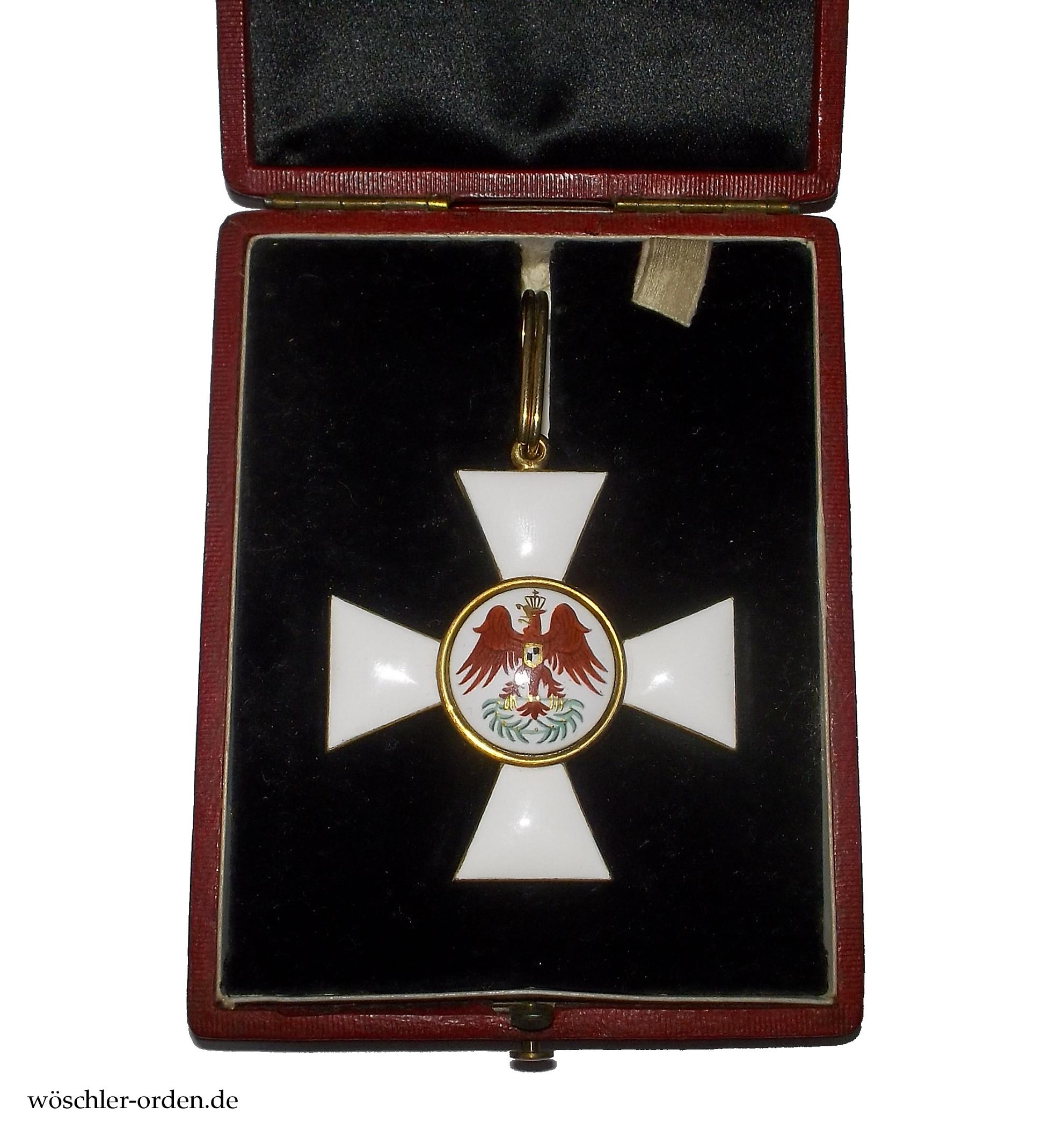 Exemplar der ersten, bis Ende 1916 gefertigten Ausgabe des fünften und endgültigen, ab 1854 verliehenen Modells mit der ziegelroten Adlermalerei. Gold und Emaille, mehrteilig teils hohl gefertigt, die Medaillons verstiftet. An der Kante des unteren Kreuzarmes Ritzmarke „W“ der Hofjuweliere Johann Wagner & Sohn, Berlin.