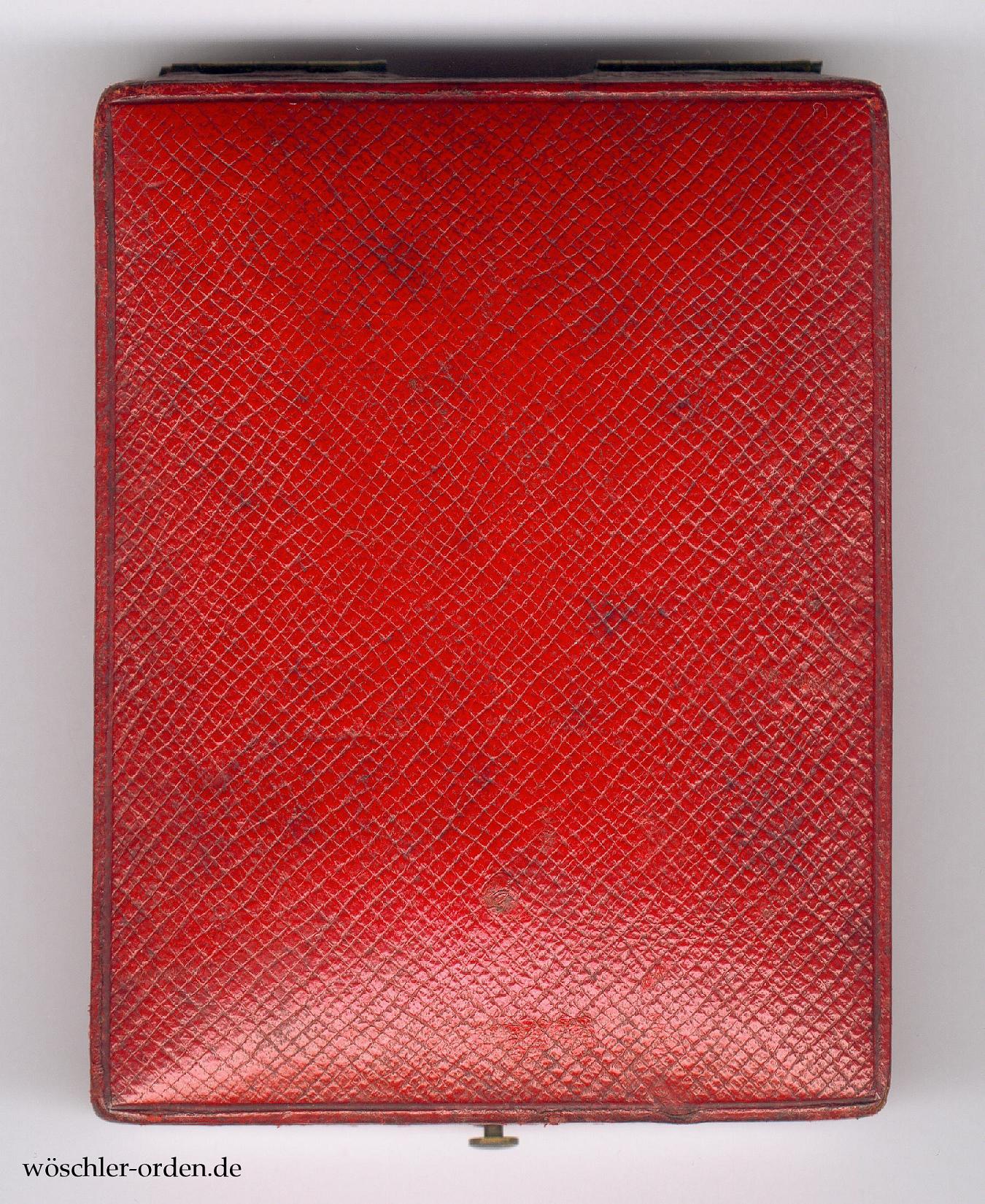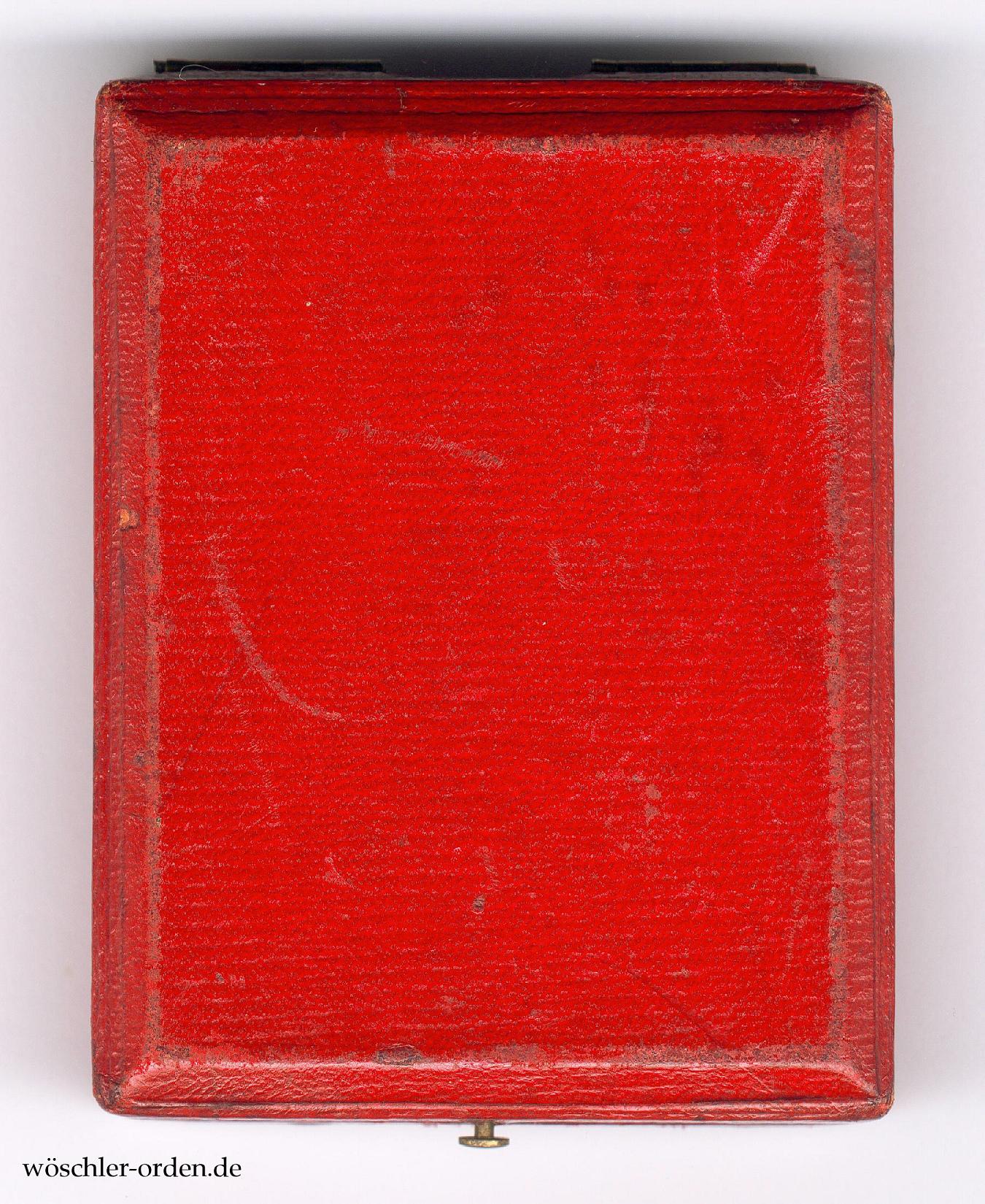 Dazu das passende Verleihungsetui aus Fertigung des Hofbuchbinders H. F. Schwartz, Berlin, in echtem Maroquinleder und mit Druckknopfverschluss, innen mit schwarzer Samteinlage mit Aussparung für das Ordenskreuz, der Himmel in schwarzer Seide verkleidet.
