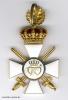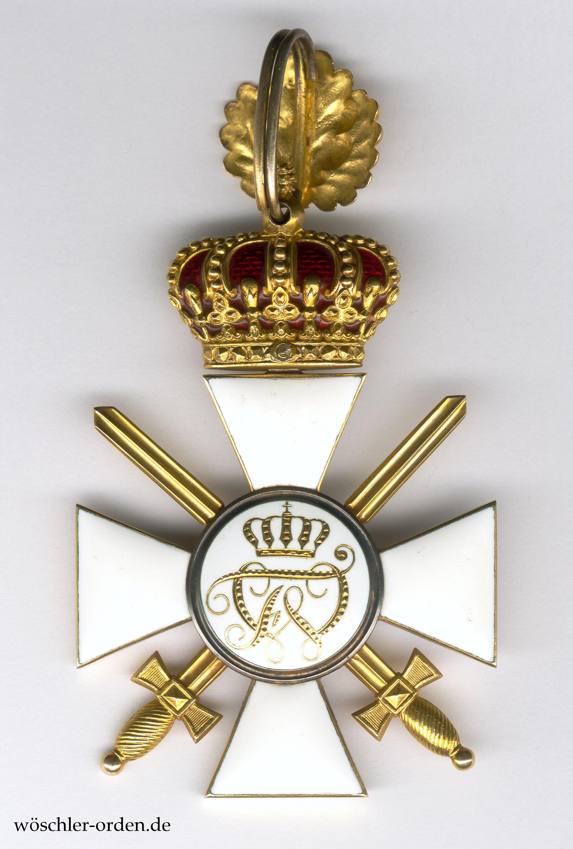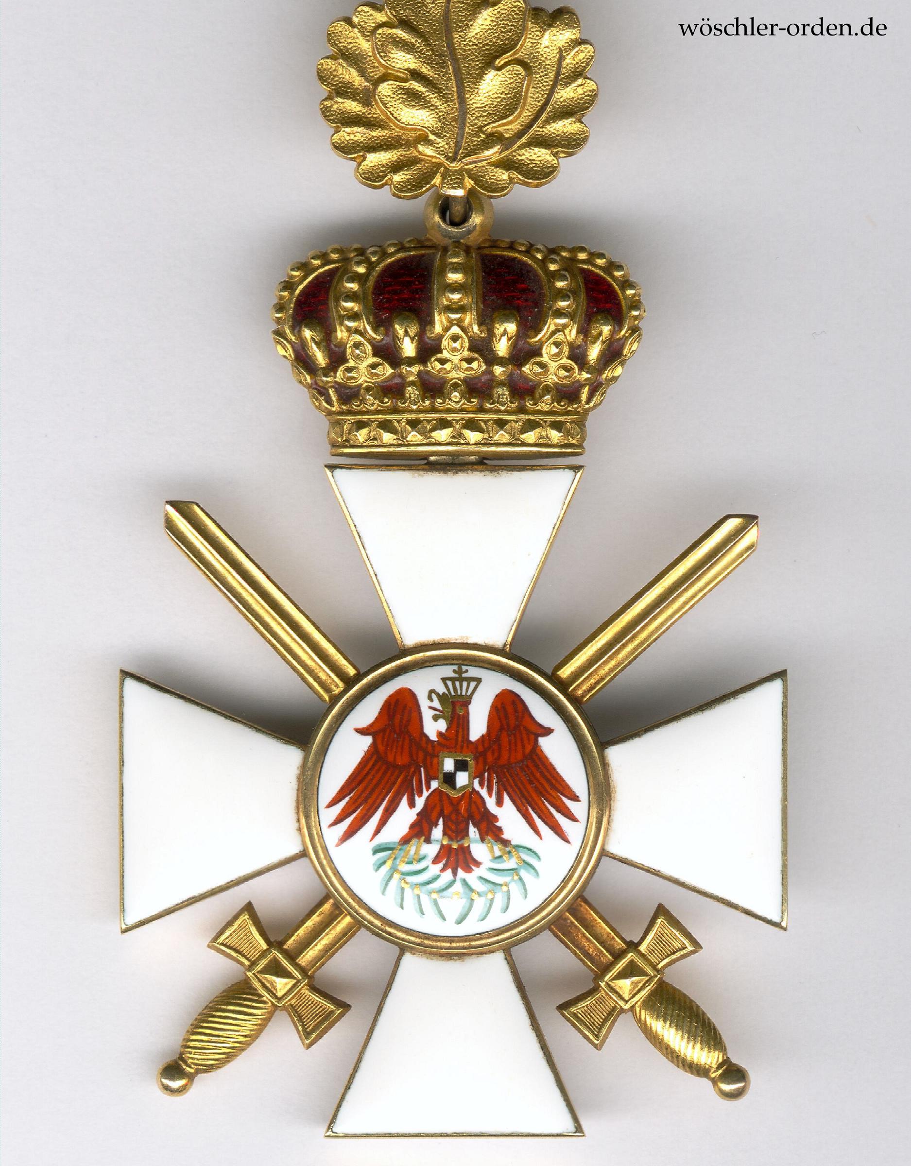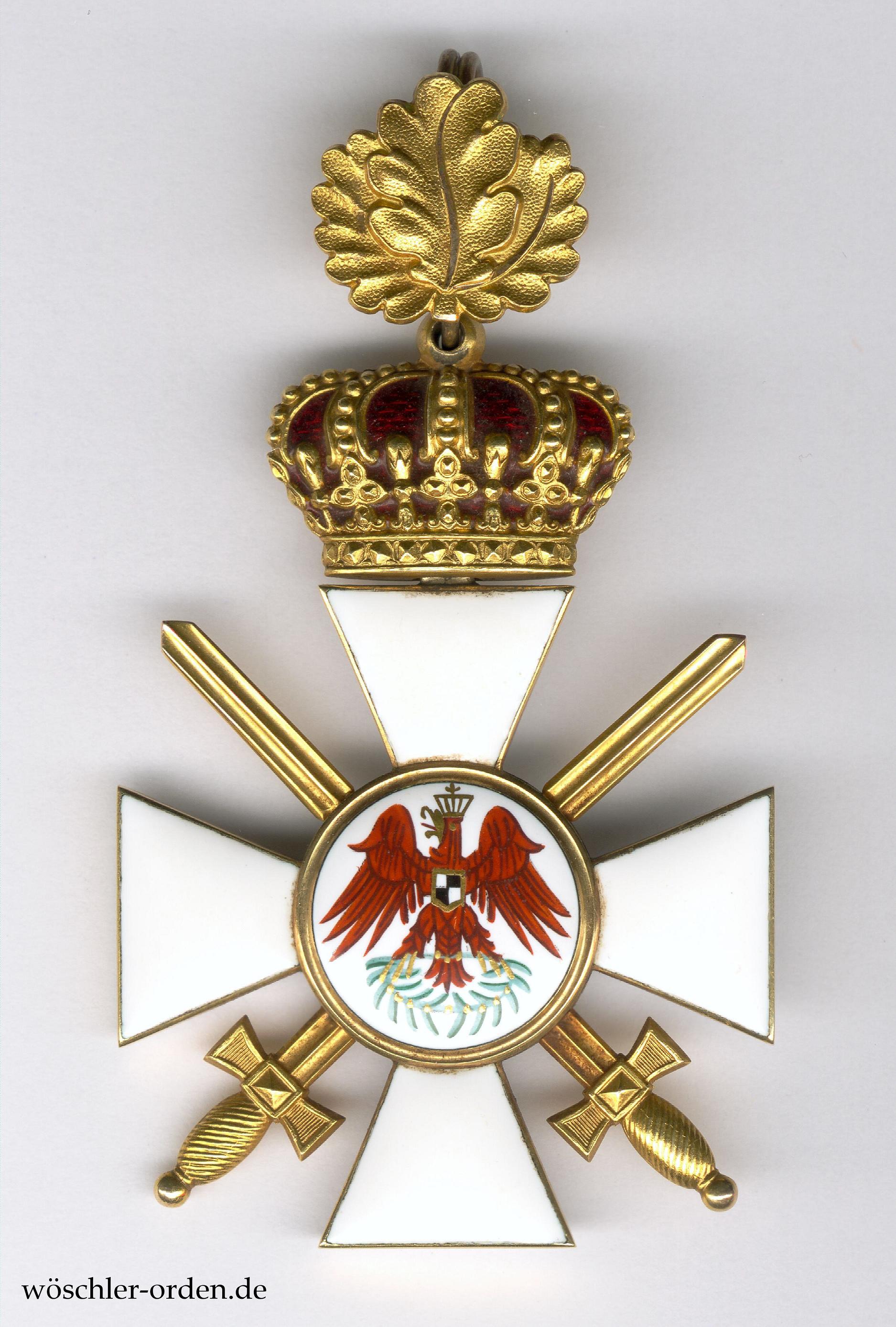 Exemplar der ersten, bis Ende 1916 gefertigten Ausgabe. Gold und Emaille, mehrteilig hohl gefertigt. Der Adler im Medaillon der Vorderseite in feinster Emaillemalerei ausgeführt, das rückseitige Monogramm gestichelt. An der Kante des unteren Kreuzarmes Ritzmarke „W“ der Hofjuweliere Johann Wagner & Sohn, Berlin. Die ebenfalls beidseitig emaillierte Königliche Krone beweglich angebracht, das Eichenlaub hohl geprägt und fein nachgraviert, die hohl gefertigten Schwerter eingeschraubt.
