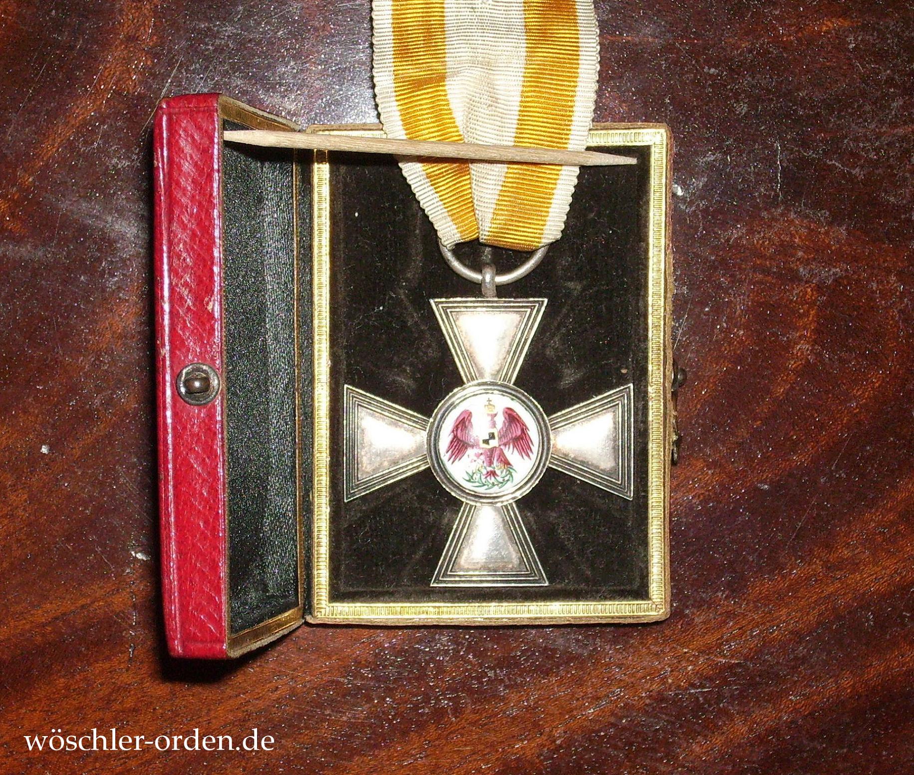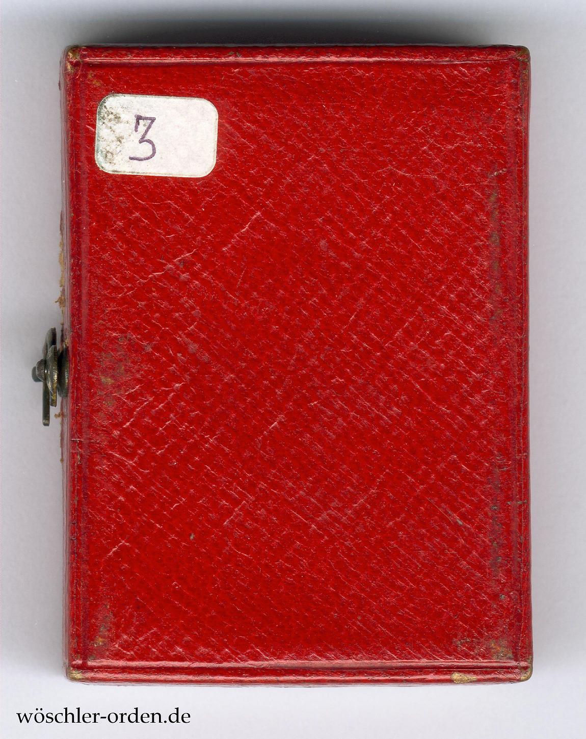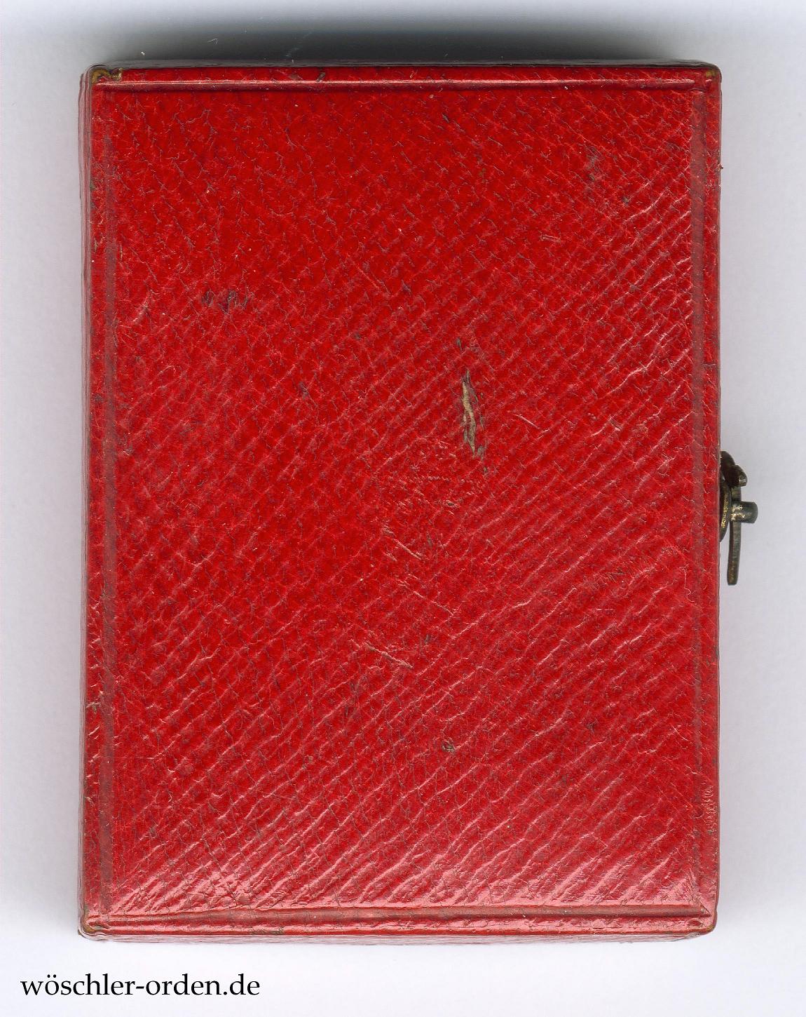 Im Verleihungsetui in Maroquinleder und mit Häkchenverschluss in den für die Zeit typischen, geringeren Abmessungen von etwa 60 mm x 44 mm.