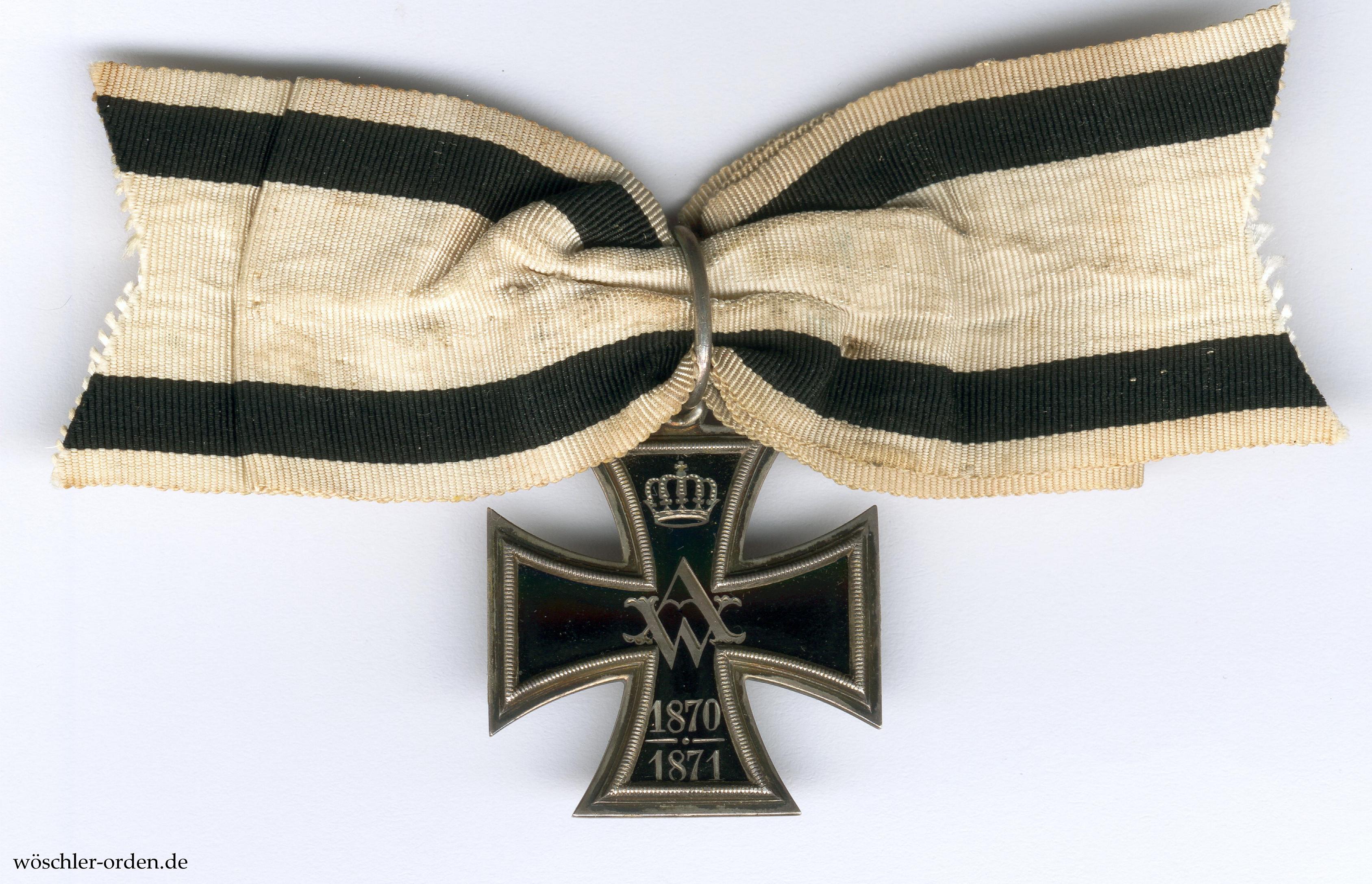 Silber, mehrteilig fertigt und schwarz emailliert, vorderseitig das auf weißem Grund gemalte Genfer Kreuz aufgelegt. Das Rückseitige Monogramm „AW“ nebst Krone und Jahreszahlen feinst nachgraviert. Ohne ersichtliche Herstellermarkierung.