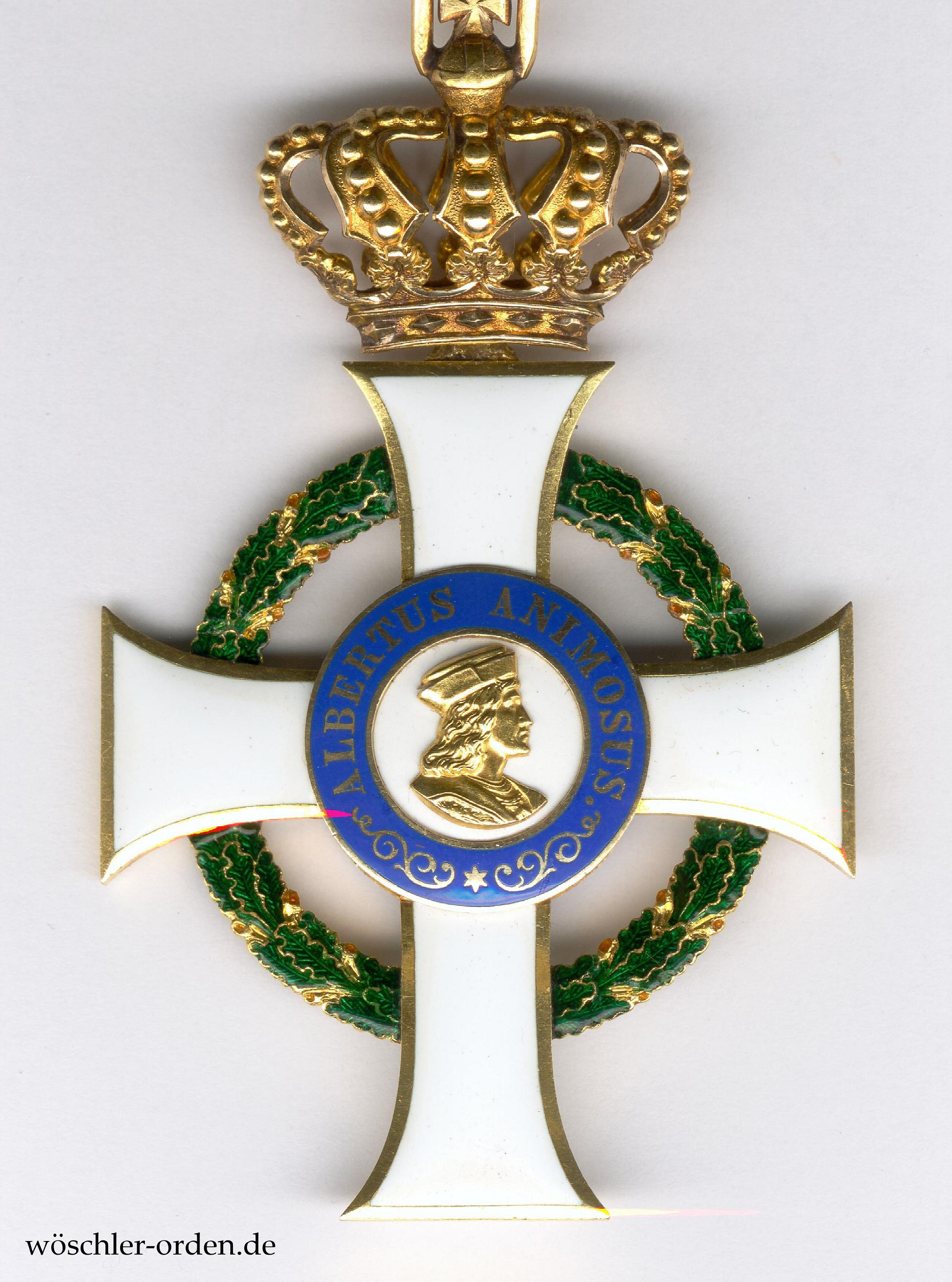 Der Königlich Sächsische Albrechtsorden wurde am 31. Dezember 1850 durch Friedrich August II. zum Andenken an den Stammvater der Albertinischen Linie des Hauses Sachsen, Herzog Albrecht den Beherzten, als allgemeiner Verdienstorden in ursprünglich fünf Klassen gestiftet. Nachdem Mitte der 1870er-Jahre festgestellt wurde, dass die Medaillons wegen einer Verwechslung den ernestinischen(!) Kurfürsten Friedrich III. darstellen, wurden die Insignien umgestaltet. Im Laufe der Jahrzehnte wurden mehrfach Klassen erweitert und umbenannt, außerdem konnten die Dekorationen ab 1866 mit Schwertern, ab 1870 auch – nach preußischem Vorbild – mit Schwertern am Ring verliehen werden. Die Verleihungen wurden mit dem Ende der Monarchie im November 1918 eingestellt. Da dieses Komturkreuz mit und ohne Stern verliehen werden konnte, und außerdem dem Großkreuzkleinod von der Trageweise abgesehen völlig gleicht, können keine sinnvollen Verleihungszahlen angegeben werden.