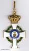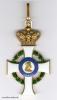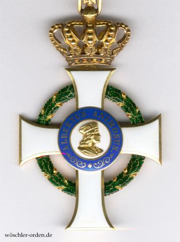 Exemplar der ersten, bis 1902/03 gefertigten Ausführung des zweiten, ab 1876 verliehenen Modells. Gold, mehrteilig gefertigt, die Kreuzarme und die Medaillonzentren opak weiß, die Medaillonringe opak blau und der die Medaillons umgebende Eichenkranz transluzid grün mit roten Eicheln emailliert. An mittels eines Scharniers beweglich angebrachter Krone, diese mit starrer, am Reichsapfel befestigter sog. „Steigbügelöse“ mit Sprungring. Von den Großkreuz-Kleinodien unterscheiden sich die Komturkreuze bei identischer Größe lediglich durch die Trageweise bzw. den Bruststern. Ohne ersichtliche Herstellermarkierung; möglicherweise handelt es sich um ein älteres, nach Rückgabe überarbeitetes bzw. aktualisiertes Kreuz.