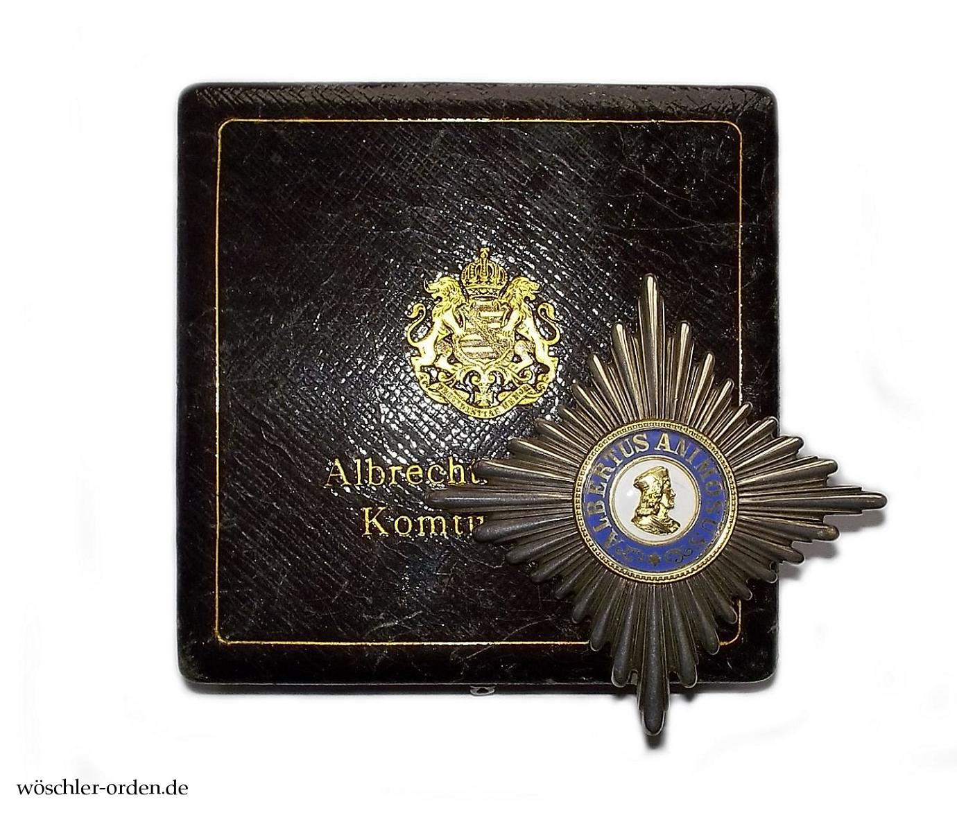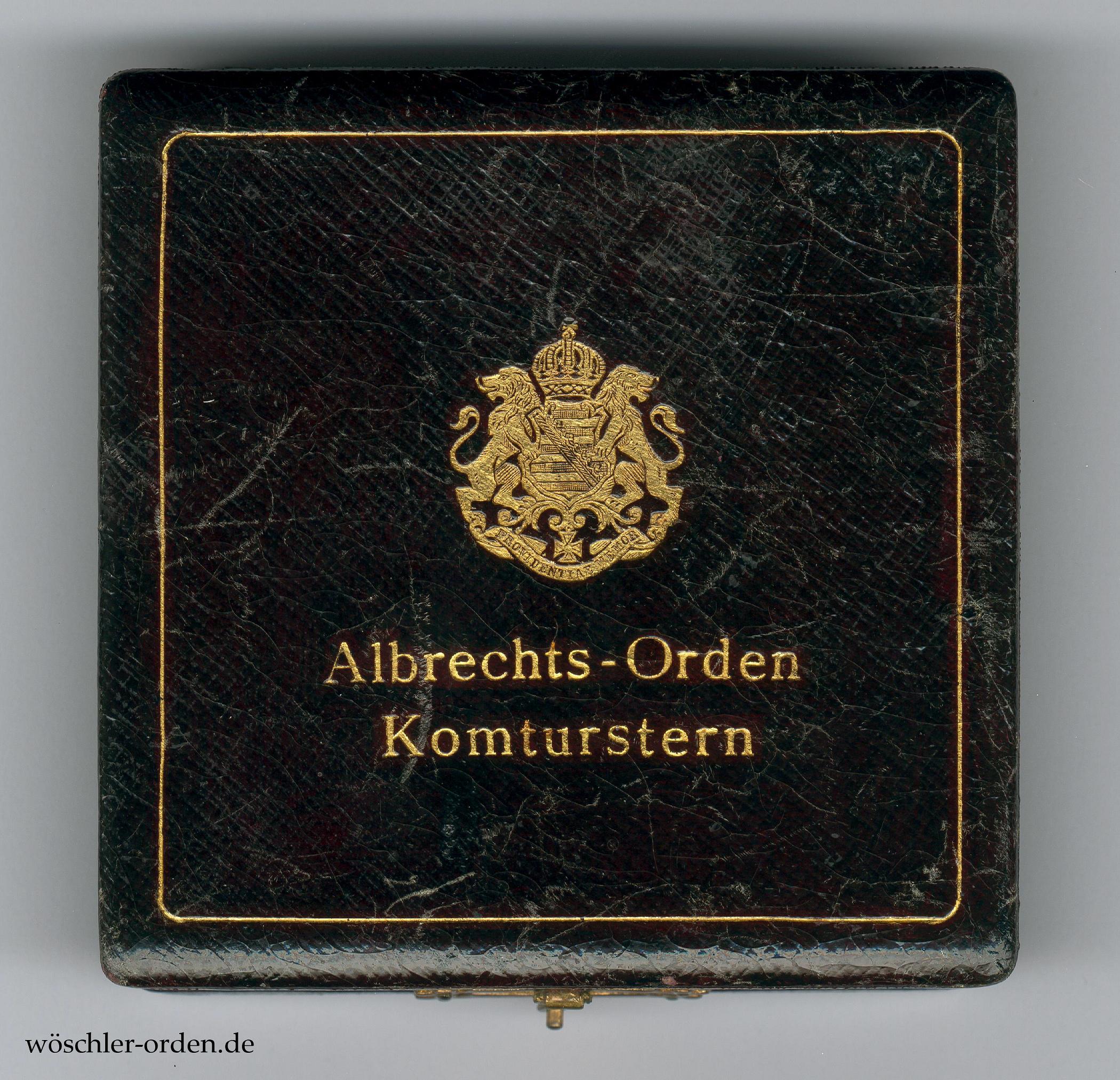 Dazu das rotbraune Verleihungsetui, goldfarben bedruckt mit dem sächsischen Wappen und der zweizeiligen Zweckinschrift „Albrechts-Orden / Komturstern“.
