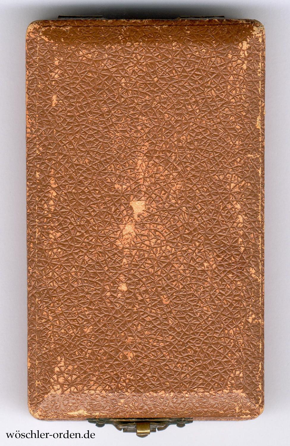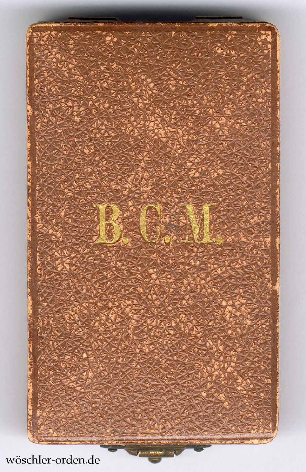 Im mit braunem Lederimitat bezogenen, goldfarben „B. C. M.“ bedruckten Verleihungsetui, dieses innen mit altweißer Samteinlage mit Aussparung für die Medaille. Der Deckel in altweißer Seide mit eingeklebtem Etikett der Ordensbandfabrik C. E. Kunath, Dresden.