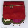 Die Schnalle mit sauber bogenförmig konfektionierten Bändern, wobei das rechte unüblicherweise über dem linken liegt, rückseitig mit stabiler Tragenadel und roter Stoffabdeckung.