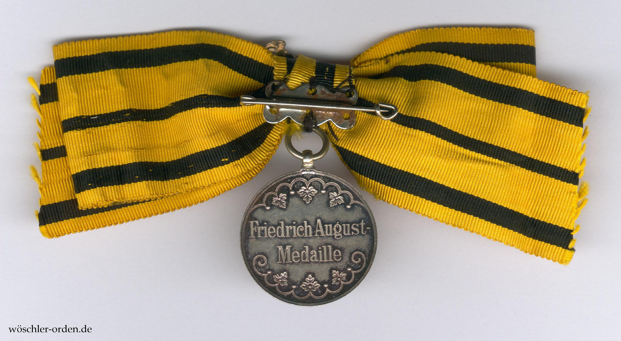 Gemäß viertem Nachtrag zu den Statuten der bereits am 23. April 1905 durch Friedrich August III. in zwei Klassen gestifteten Friedrich-August-Medaille vom 22. Mai 1916 können „besondere vaterländische Verdienste“ während des Weltkriegs in der Heimat „durch Verleihung einer auf dem Friedensbande zu befestigenden Spange besondere Anerkennung finden“. Diese Spangen entsprechen denen der Carola-Medaille: für Männer viereckig, für Frauen ein mit zwei Eicheln verziertes Eichenblatt, jeweils mit Inschrift „Weltkrieg 1914–16“ bzw. „Weltkrieg 1914–18.“. An weibliche Personen erfolgten insgesamt 449 Verleihungen der Friedrich-August-Medaille in Silber mit der Spange, die nicht auf die beiden Varianten aufgeschlüsselt werden können, da scheinbar nicht bekannt ist, wann die Inschrift geändert wurde.