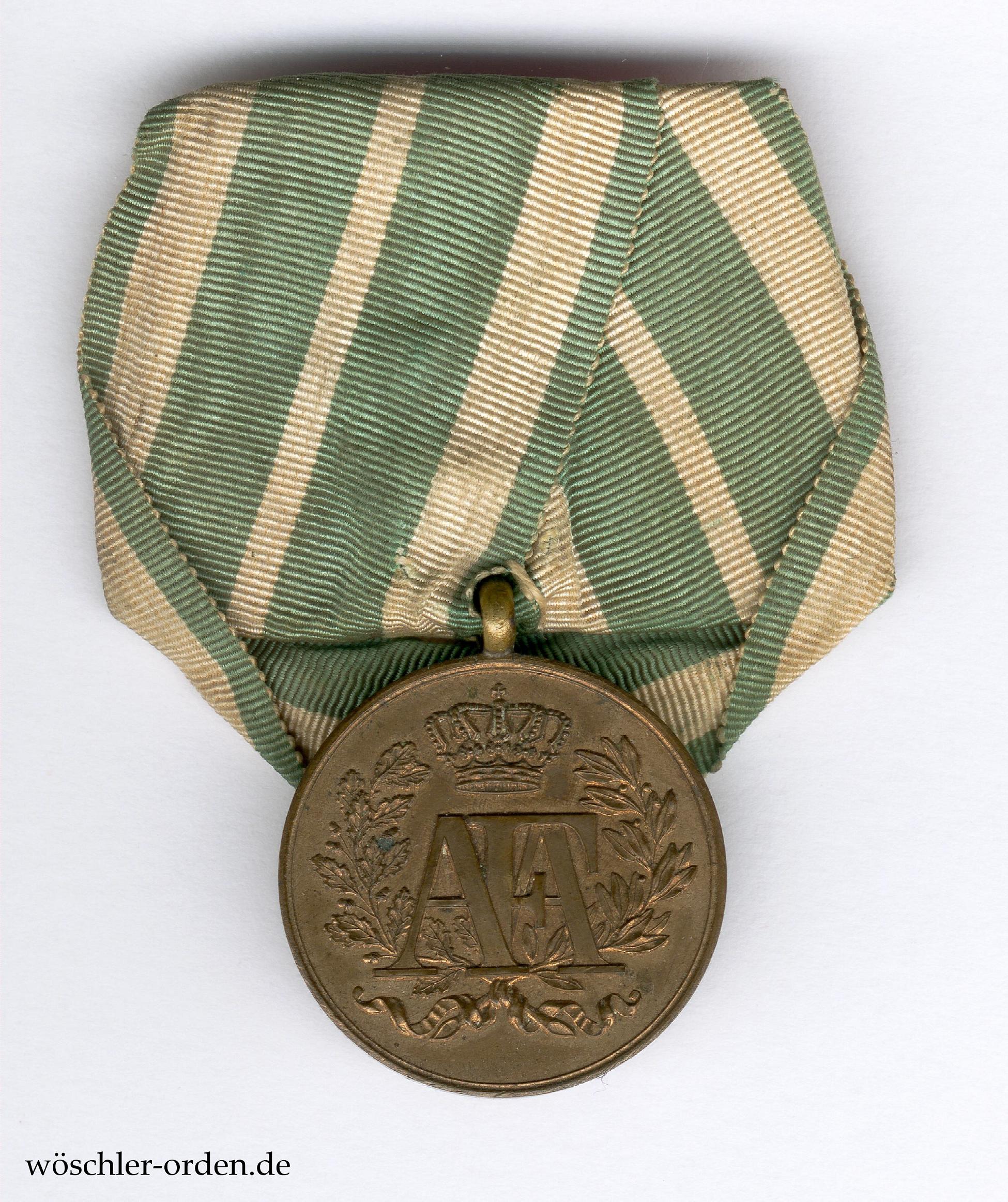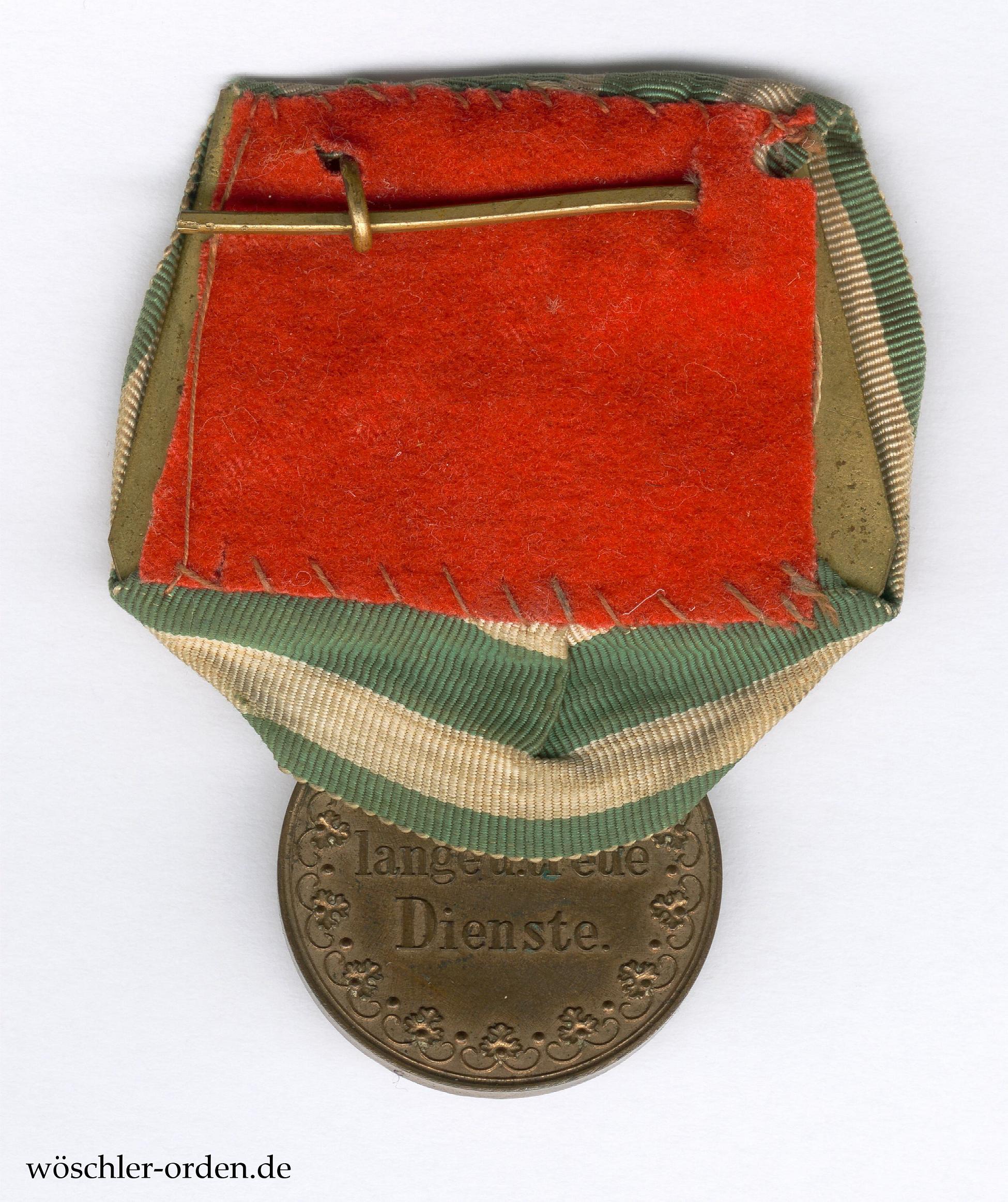 Exemplar des älteren, bis 1913 verliehenen Modells. Bronze geprägt, an angelöteter, kräftiger Ringöse mit Bandring. Die Stempel zu den Medaillen mit der Inschrift „für / lange u. treue / Dienste.“ schnitt Max Barduleck 1878. Bis 1913 wurden in Bronze insgesamt 10.726 Exemplare geprägt.