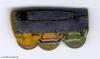 Die Miniaturen mit jeweils etwas 16 mm Durchmesser, an bogenförmig vernähten Bändern. Rückseitig blaue Stoffabdeckung und große Sicherheitsnadel.