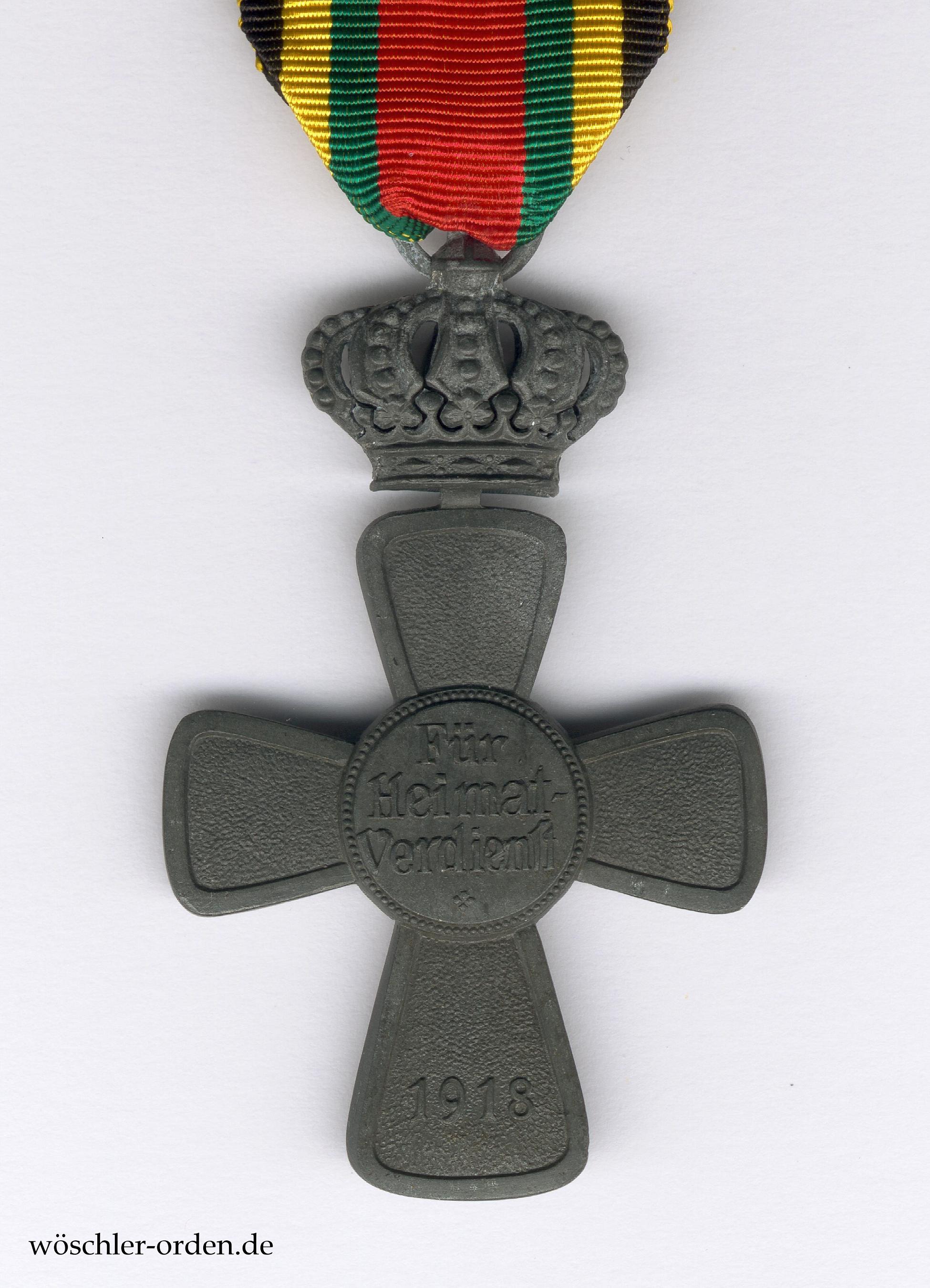 Das Ehrenkreuz für Heimatverdienst, bei von Hessenthal und Schreiber als „Verdienstkreuz für Heimatverdienste während der Kriegsjahre 1914/18“ bezeichnet, wurde durch Großherzog Wilhelm Ernst am 27. Januar 1918, dem Geburtstag Kaiser Wilhelm II., „für Männer ohne Unterschied des Ranges und Standes, die während des Kriegs mittelbar oder unmittelbar im Interesse der Kriegsführung und in der Förderung gemeinnütziger Bestrebungen Hervorragendes geleistet haben“ gestiftet. Ferner konnte „es solchen verliehen werden, die sich während des Krieges in der Heimat um Uns und Unser Land im besonderen Maße verdient gemacht haben“. Insgesamt können 366 Verleihungen belegt werden, darunter 348 bis zum Ende der Monarchie. Die tatsächliche Zahl dürfte zumindest etwas höher liegen.