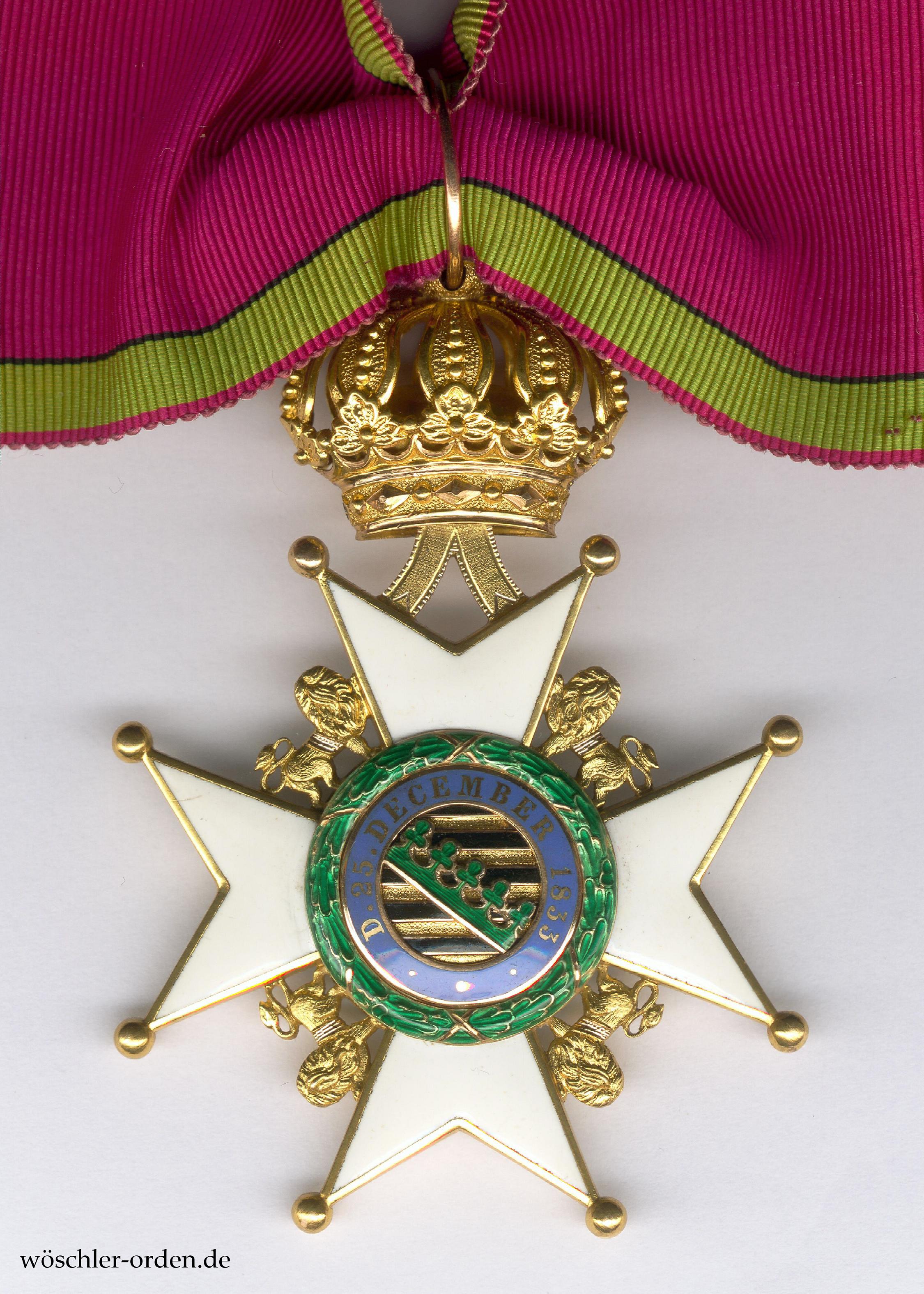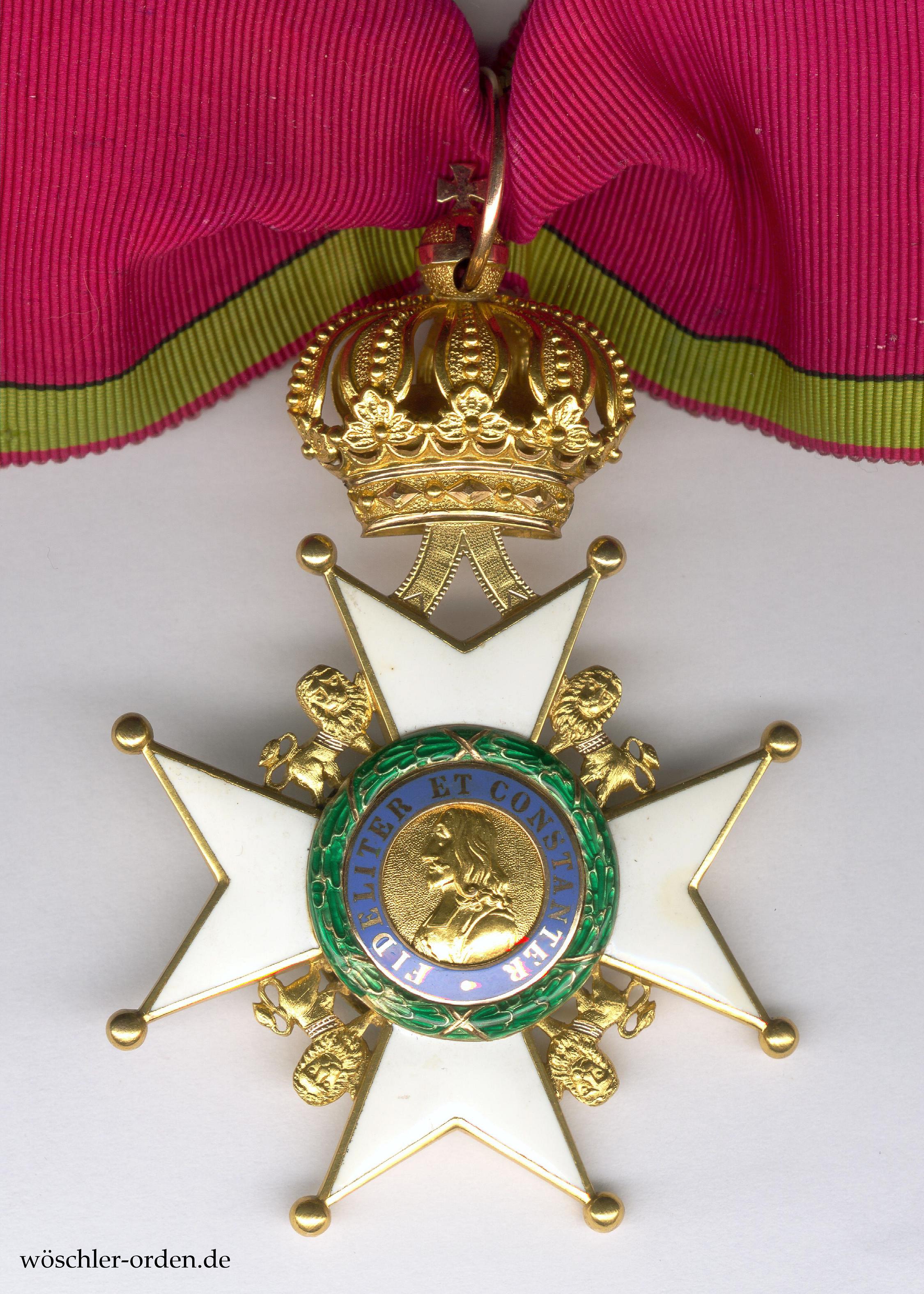 Exemplar des zweiten, angeblich ab 1864 verliehenen Modells, ohne aufgelegten Buchstaben auf dem oberen Kreuzarm, in einer Fertigung aus der Zeit um etwa 1900. Gold, mehrfarbig gearbeitet und emailliert, die Krone, Kronenbänder und Löwen feinst nachgearbeitet.