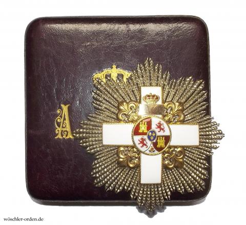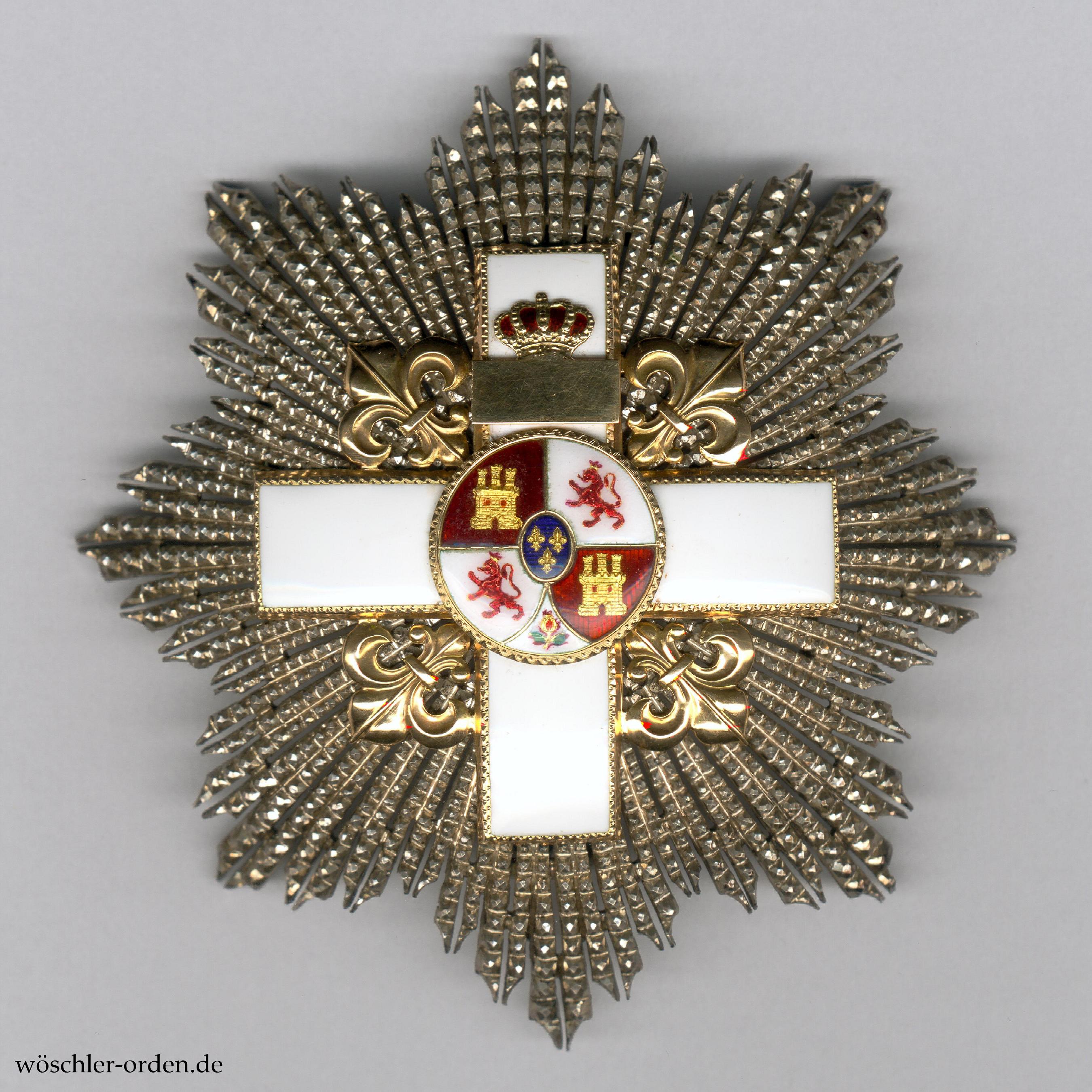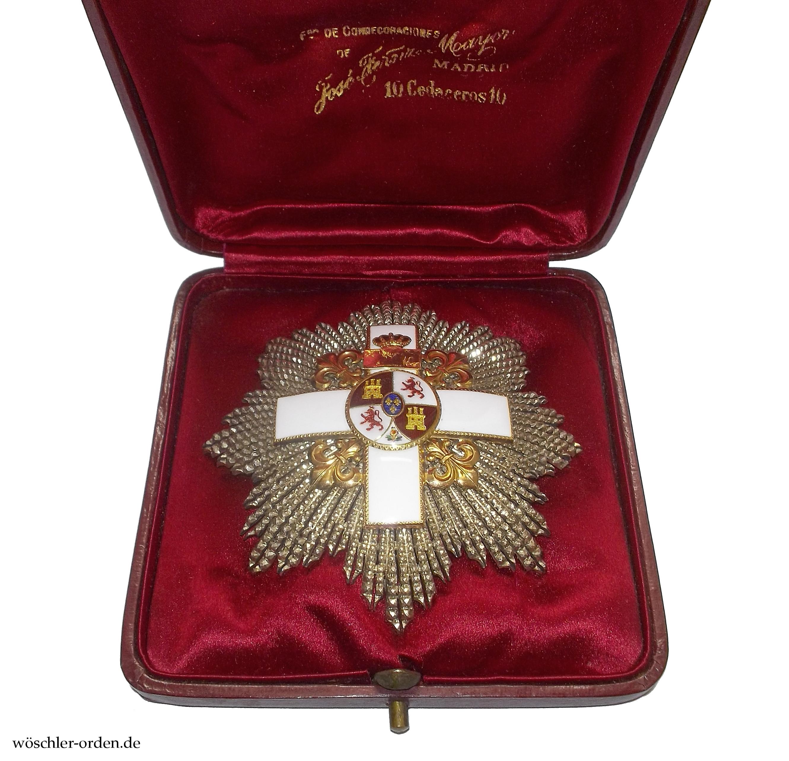 Exemplar des sechsten, von 1875 bis 1931 verliehenen Modells des Fünften Spanischen Königreiches, in einer besonders ansprechenden und hochwertigen Fertigung von José Fernandez Mayor, Madrid, um 1908. Der Korpus aus Silber, ausgesägt und vorderseitig brillantiert. Die Auflage in Gold, Emaille und feinster Emaillemalerei, die Einfassungen des Kreuzes und des Medaillons feinst nachbearbeitet. Rückseitig halbrunde Tragenadel sowie zwei zusätzliche Haltehaken, mittig aufgelegtes querovales Plättchen mit Herstellerangabe.