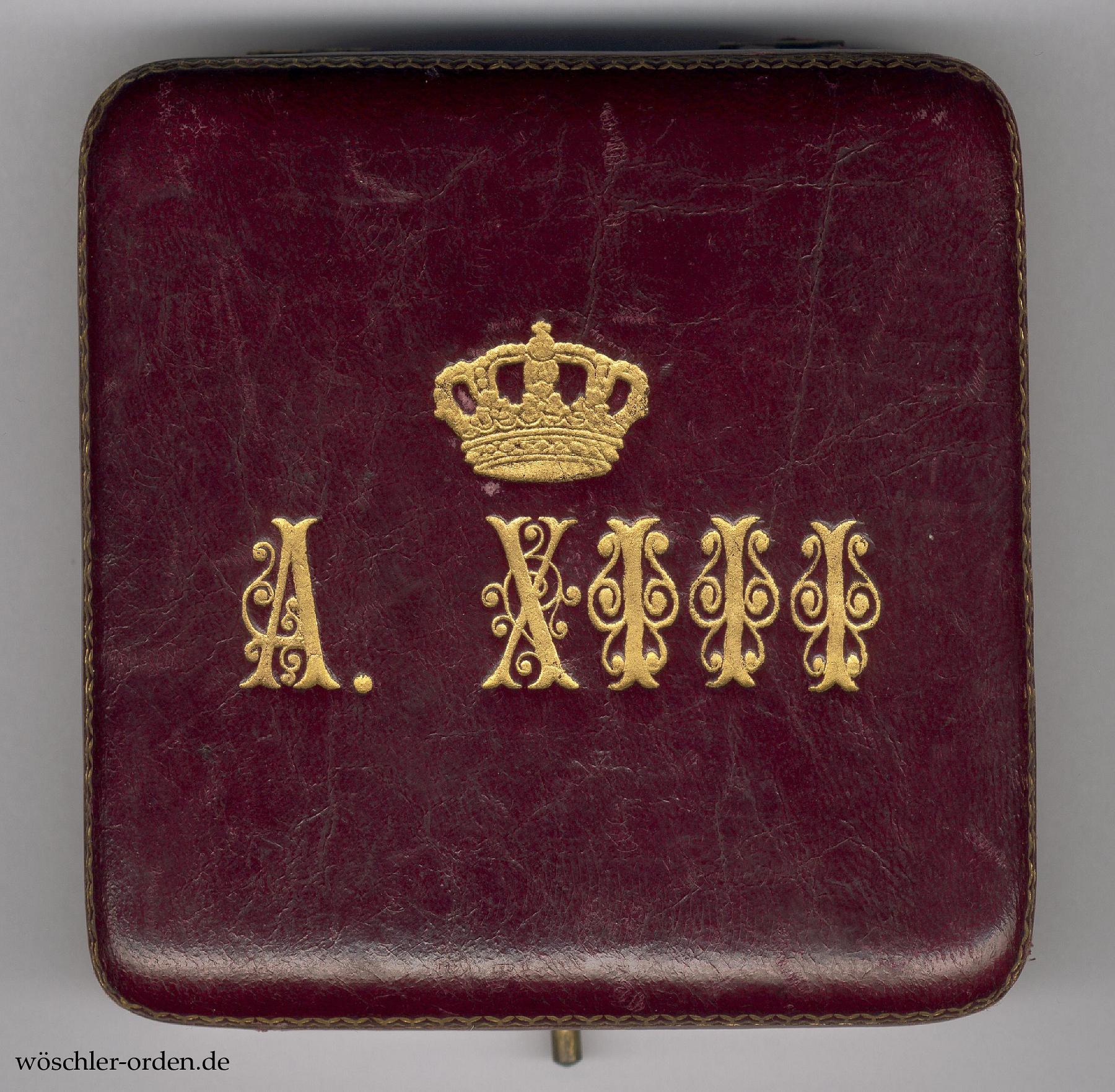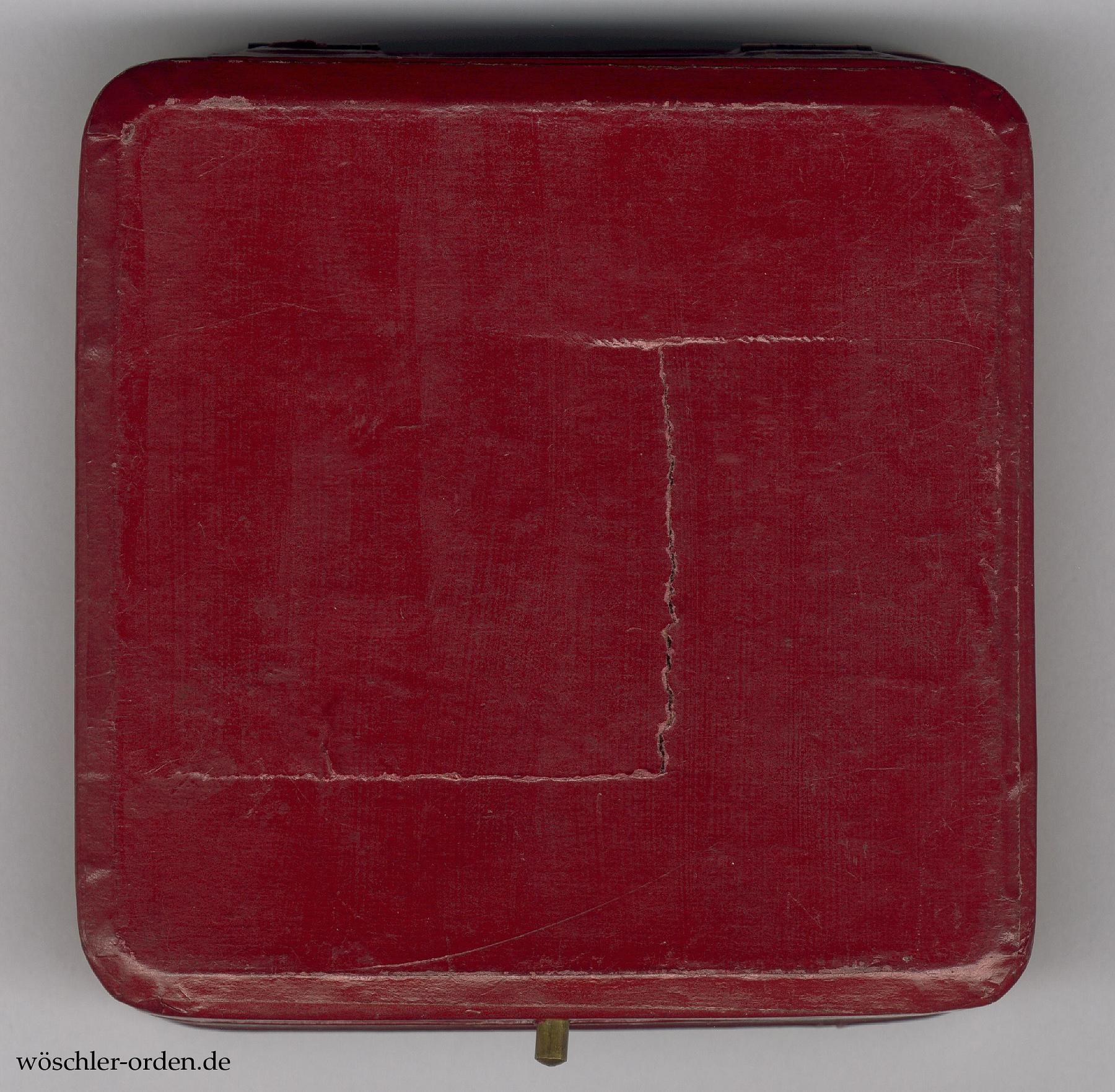 Dazu das rechteckige, mit weinrotem Leder oder Lederimitat bezogene Verleihungsetui mit dem golden aufgeprägten, bekröntem Monogram König Alfons XIII.. Die Innenverkleidung in weinroter Seide, im Boden mit Halterung für die Tragenadel, im Himmel mit ebenfalls goldgeprägtem Signet bzw. Schriftzug des Herstellers.