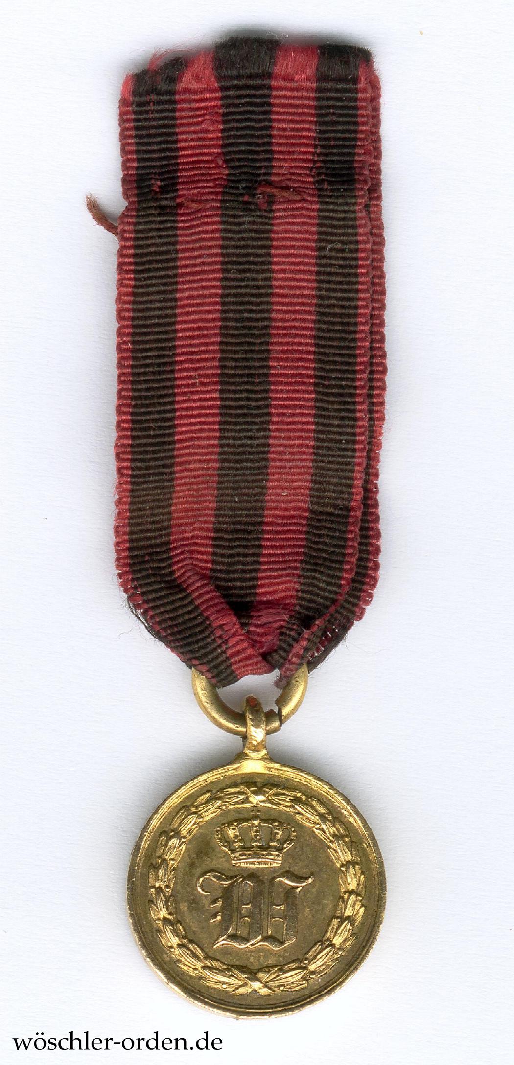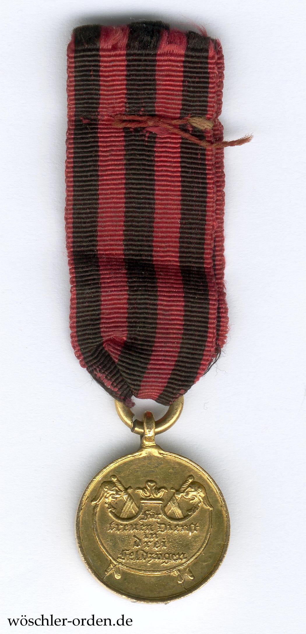 Miniatur, etwa 18 mm, der Ausgabe „Für treuen Dienst in drei Feldzügen“. Bronze geprägt und vergoldet, an Ringöse mit Bandring.