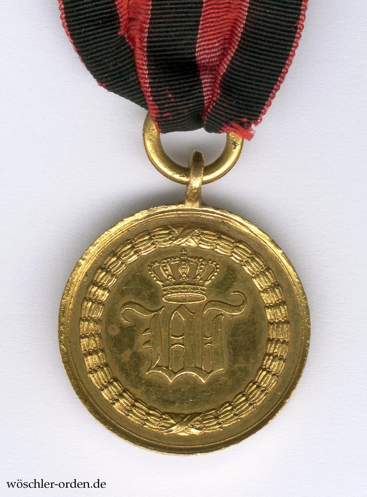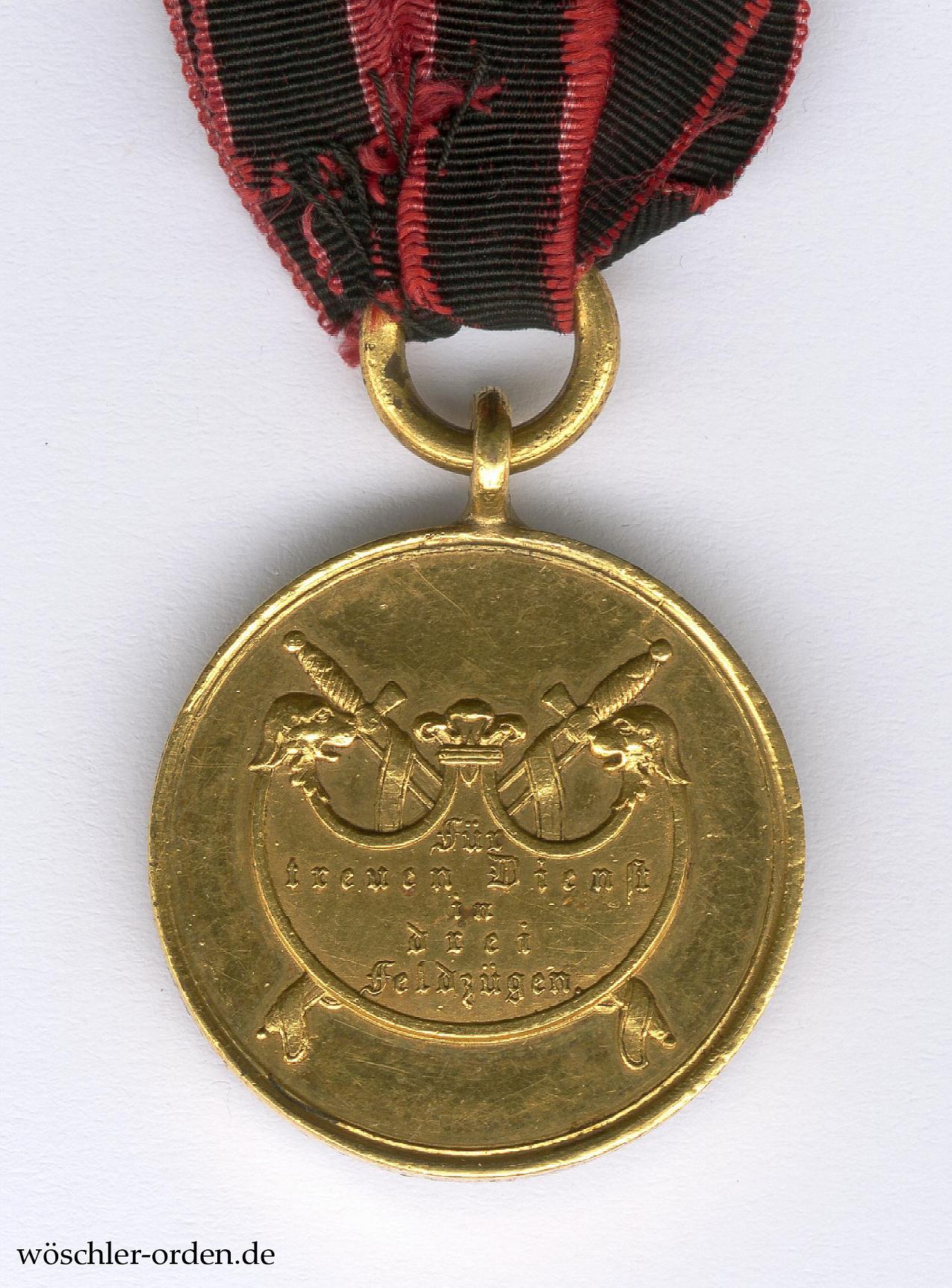 Ausgabe „Für treuen Dienst in drei Feldzügen“. Bronze geprägt, an angelöteter Ringöse mit geschlossenem Bandring. Exemplar mit, nach Klein und Raff, Stempelkopplung „1/1“, also der unsignierten Vorderseite und der Rückseite mit der kleineren Schrift.