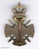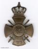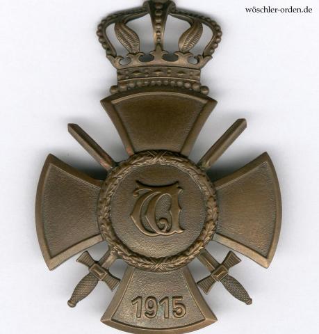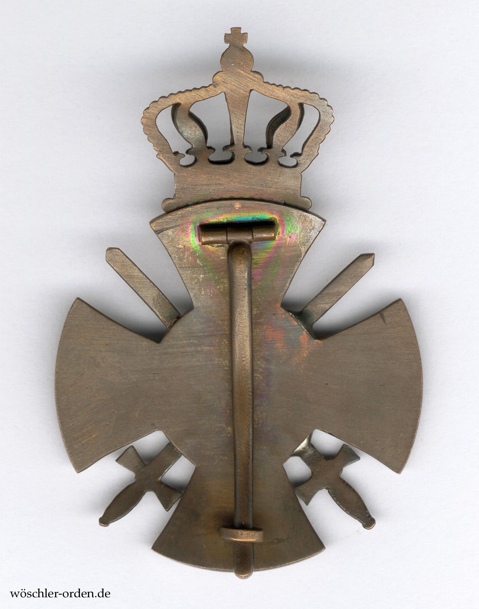Ausgabe mit Schwertern und Krone, wie sie zur besonderen Auszeichnung exponierter Militärpersonen, unabhängig ihres Kombattantenstatus’, bestimmt war. Bronze einseitig geprägt, die Schwertgriffe und -klingen separat gefertigt. Die das Kreuz überhöhende Krone aus zwei Hälften hohlgeprägt und angelötet. Rückseitig stabiles Nadelsystem, hier ohne die teilweise vorkommende Sicherung. Eine Chronologie dieser Varianten ist mir nicht bekannt.