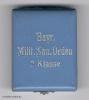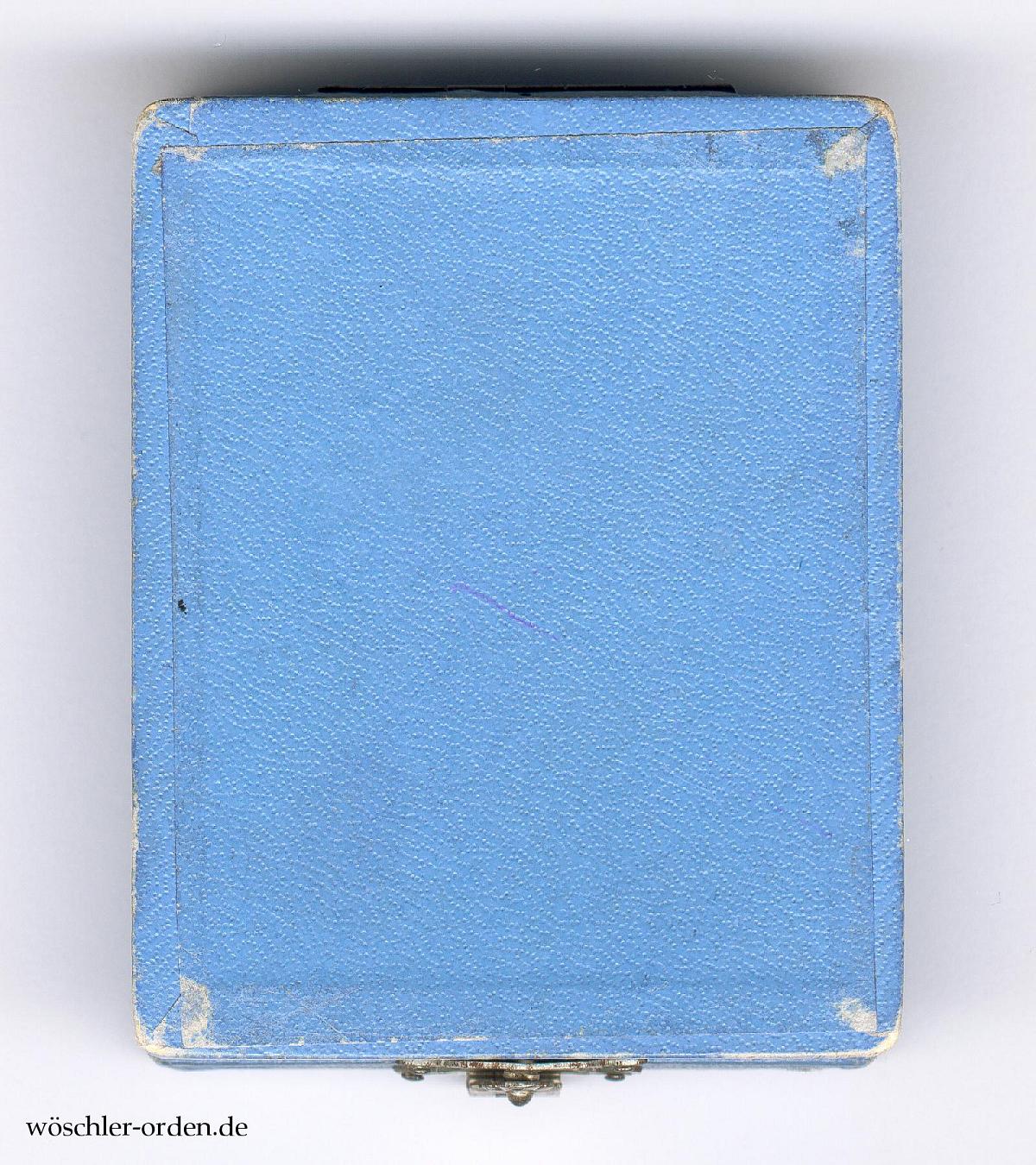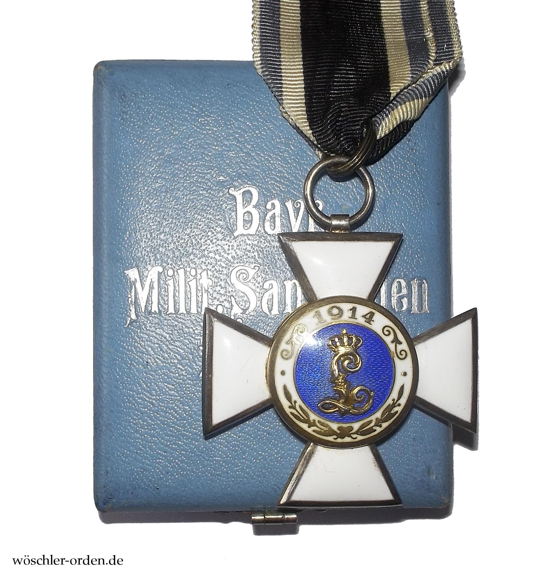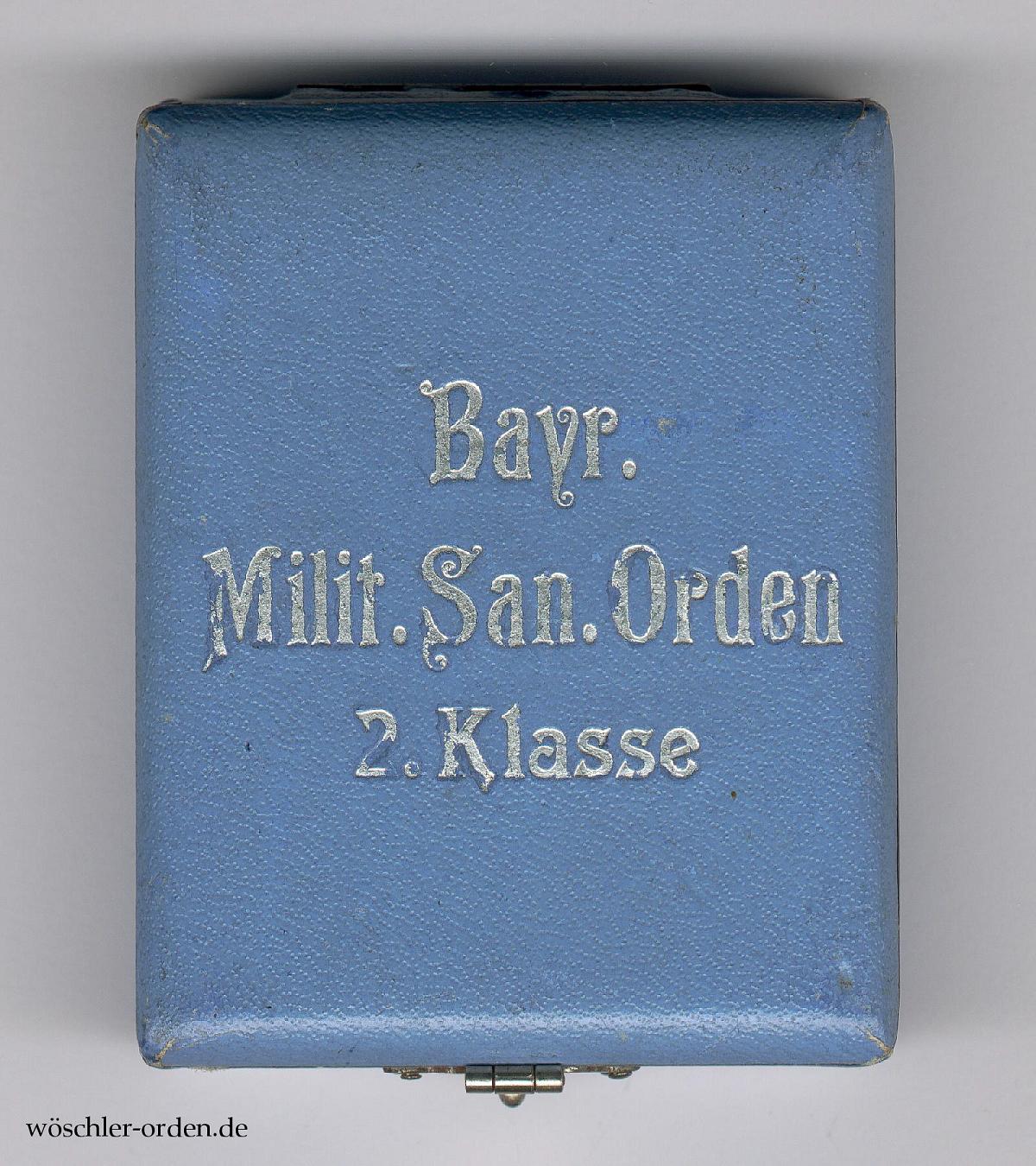 Dazu das mit hellblauem Lederimitat bezogene Verleihungsetui, der Deckel mit dreizeiligem Aufdruck „Bayr. / Milit. San. Orden / 2. Klasse“ in Silber. Innen weinrote Samteinlage mit Aussparung für das Ordenskreuz, der Himmel in ebenfalls weinroter Seide verkleidet und mit goldenem, eingeprägtem Signet der Firma Gebr. Hemmerle, Maximilianstraße 41, München.
