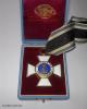 Die Emaille des unteren Kreuzarmes rückseitig mit einem Riss, außerdem das Monogramm im Medaillon der Vorderseite scheinbar mit etwas Klebstoff nachfixiert. Hiervon abgesehen gute, leicht getragene Erhaltung, jedoch die Vergoldung naturgemäß etwas verblasst. An über 30 cm langem, zum Tragen am Halse konfektioniertem Band wohl aus den 1950er-Jahren. Das Verleihungsetui in altersgemäß guter Erhaltung mit nur leichten Gebrauchs- und Lagerspuren, allerdings, wie so oft, die seidene Halterung für das Band zerschlissen.