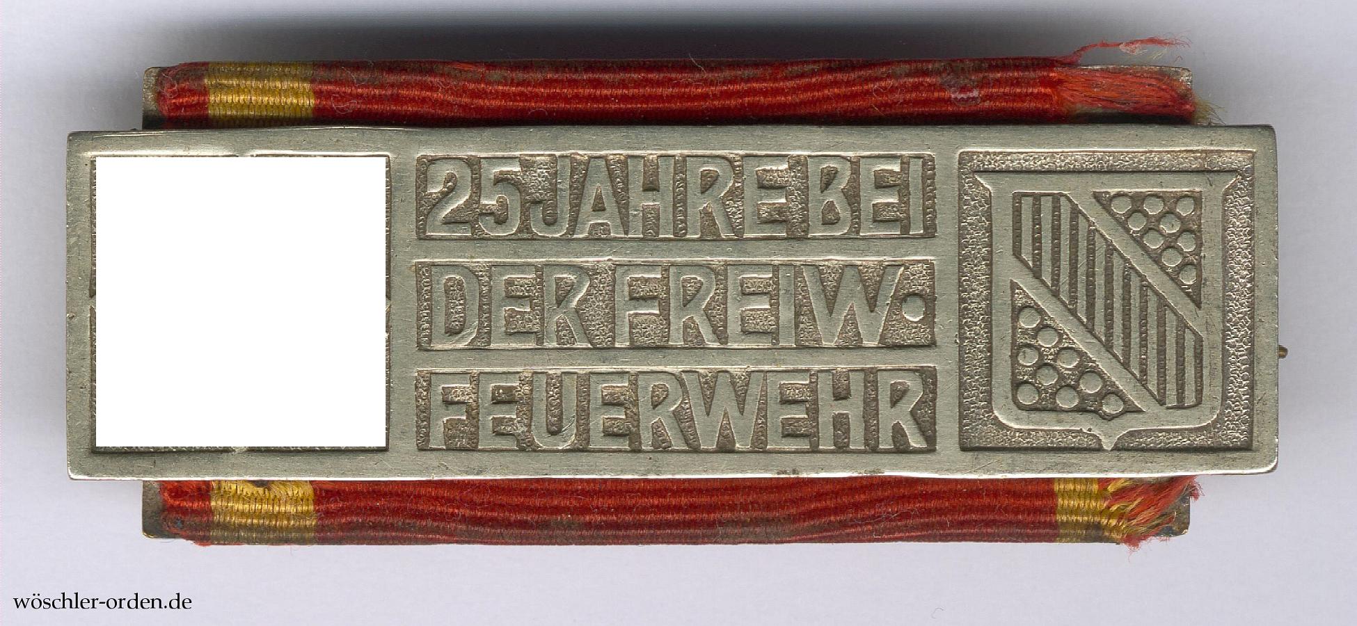 Großherzogtum und Freistaat Baden, Ehrenzeichen für 25-jährige Dienstleistung bei der Freiwilligen Feuerwehr, verliehen 1877 bis 1936, bzw. bis 1918 als „Ehrenzeichen für Mitglieder der Freiwilligen Feuerwehren für 25 Dienstjahre“.