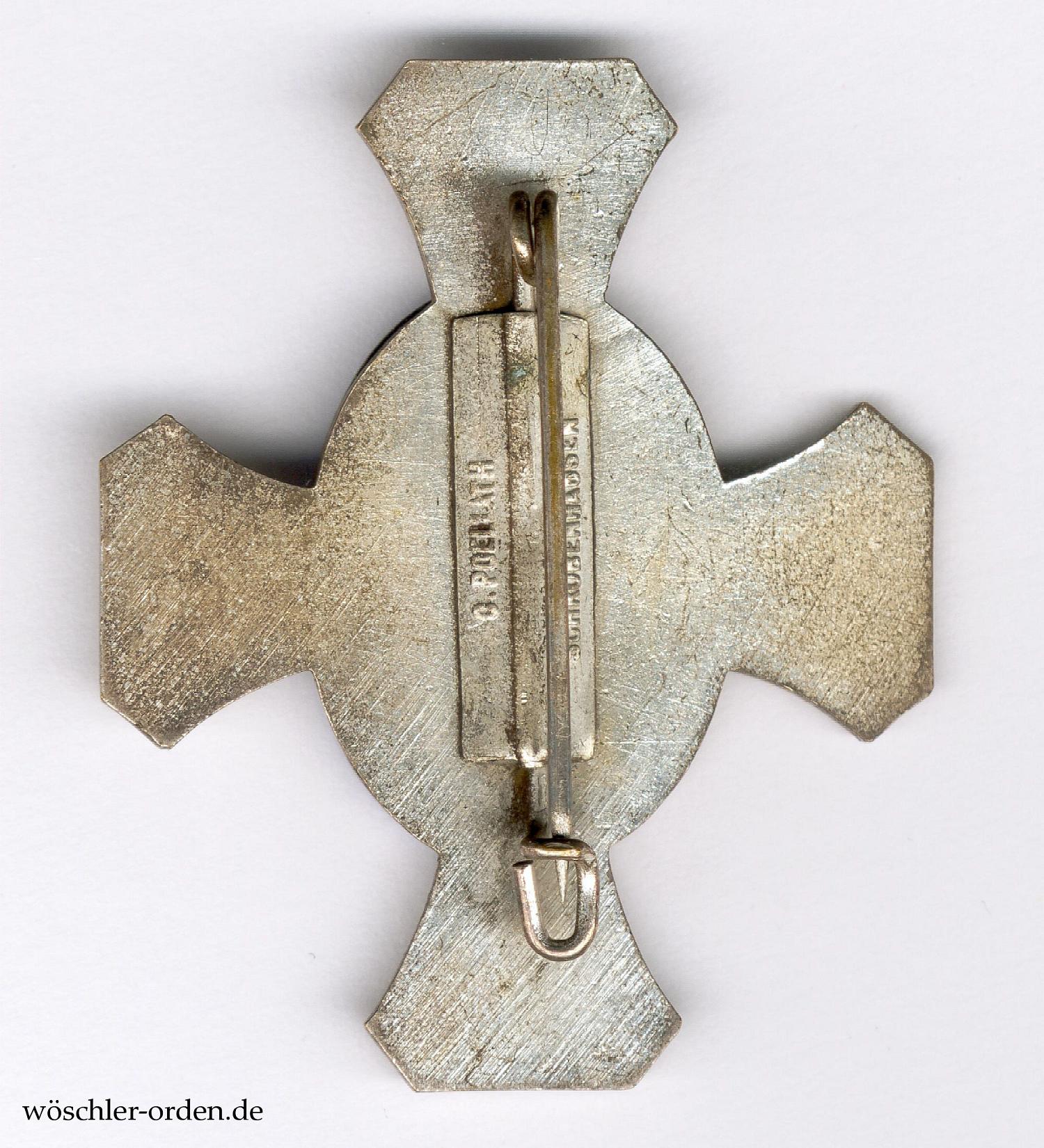 Buntmetall einseitig geprägt und versilbert, das vorderseitige Medaillon separat gefertigt, ebenfalls versilbert sowie teilweise emailliert. Rückseitig broschiertes Nadelsystem, das Plättchen mit zweizeiliger, erhaben mitgeprägter Herstellerangabe „C. POELLATH / SCHROBENHAUSEN“.