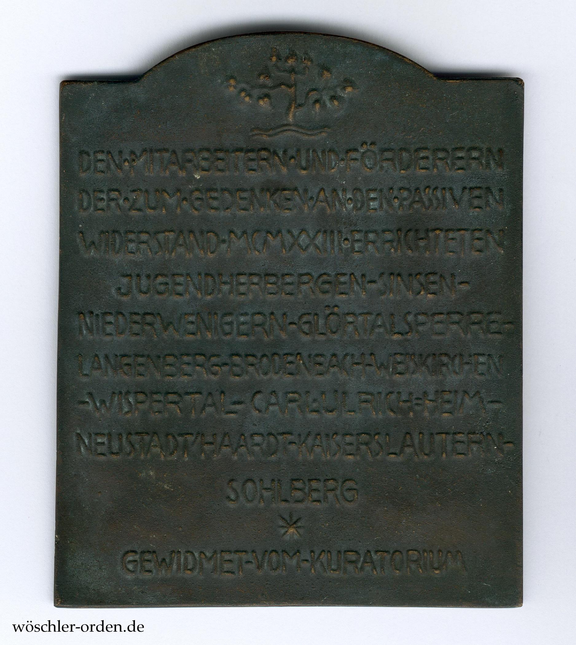 Bronzeguss, etwa 12,5 cm x 10,5 cm, ohne Künstler- oder Gießereisignatur. Vorderseitig Darstellung dreier Personen mit einer Fahne, im Hintergrund links Wald und rechts Fabrikschornsteine. Oben links „1928“, oben rechts „1929“, unten Inschrift „DIE DEUTSCHEN / GEWERKSCHAFTEN / DER DEUTSCHEN / ~ JUGEND ~. Rückseitig unter einem stilisierten Baum umfangreiche Widmung „DEN.MITARBEITERN.UND.FÖRDERERN / DER.ZUM.GEDENKEN.AN.DEN.PASSIVEN / WIDERSTAND.MCMXXIII.ERRICHTETEN / JUGENDHERBERGEN-SINSEN-/NIEDERWENIGERN-GLÖRTALSPERRE-/LANGENBERG-BRODENBACH-WEISKIRCHEN / -WISPERTAL-CARL-ULRICH=HEIM- / NEUSTADT/HAARDT-LAISERSLAUERTN- / SOHLBERG / * GEWIDMET-VOM-KURATORIUM“.