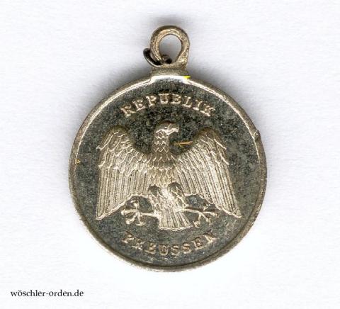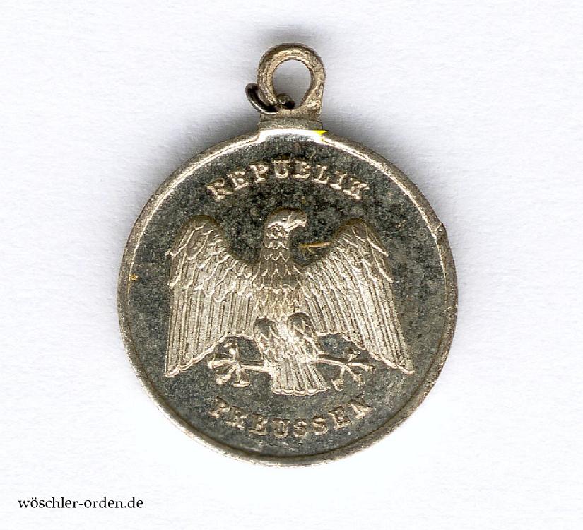 Miniatur, etwa 16 mm, der von 1925 bis 1933 geprägten zweiten Ausgabe des zweiten, republikanischen Modells, mit dem Hoheitszeichen des Freistaates Preußen und der Inschrift „REPUBLIK / PREUSSEN“. Buntmetall geprägt und versilbert, an angelöteter Parallelöse.