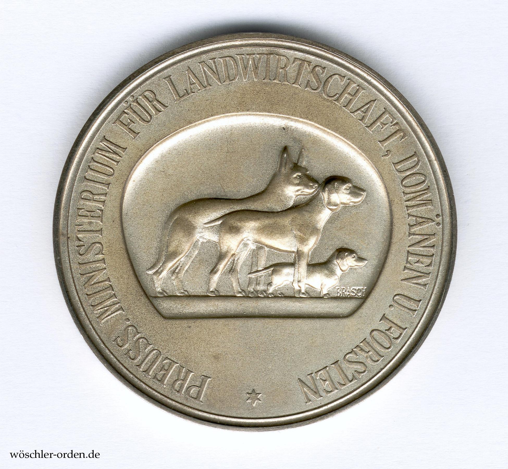 Exemplar der ersten, bis 1932 verliehenen Ausgabe mit Inschrift „PREUSS. MINISTERIUM FÜR LANDWIRTSCHAFT, DOMÄNEN U. FORSTEN“ des zweiten, von 1921 bis 1934 verliehenen freistaatlichen Modells, in der späteren, „echten“ Ausgabe. Silber geprägt und mattiert, mit der Künstlersignatur „BRASCH“ auf der Vorderseite. In Silber wurden hiervon zwischen 1926 und 1932 insgesamt 250 Exemplare geprägt, nachdem bereits seit 1921 eine Interimsprägung aus Eisen stattfand.