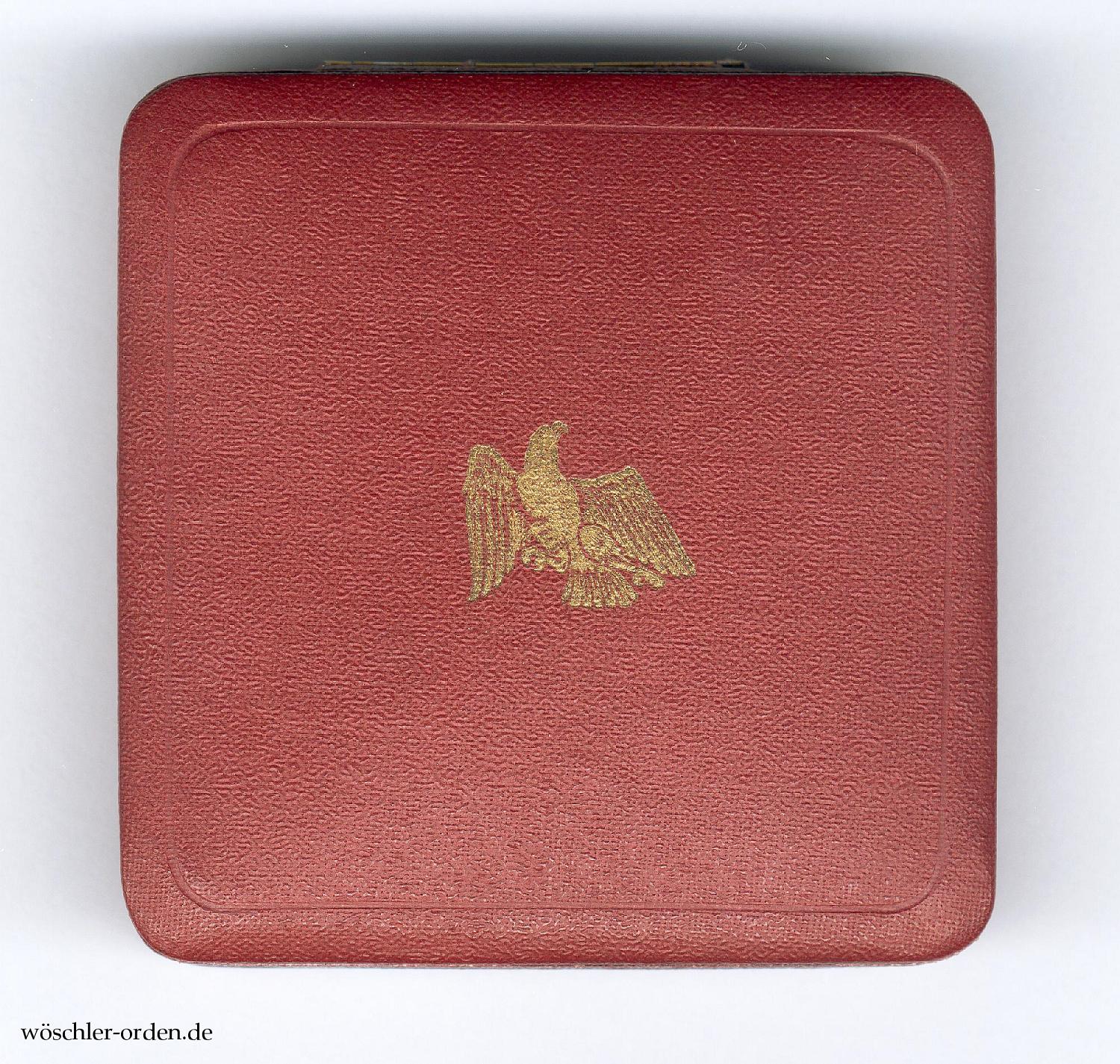Im rechteckigen, mit weinrotem Kaliko bezogene Verleihungsetui, dessen Deckel mit golden aufgeprägtem preußischem Adler. Innen eine weinrote Samteinlage mit Aussparung für die Medaille, der Deckel in altweißer Seide verkleidet. Auf dem Boden eingeprägte zweizeilige Herstellerangabe „Preuss. Staatsmünze / Berlin S. W. 19“.