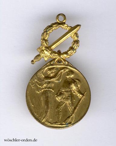 Miniatur, etwa 17 mm. Bronze geprägt und vergoldet, an mitgeprägtem, gelochtem Ösensegment mit über ein kleines Ringchen angebrachtem Kampfabzeichen, dieses oben mit angeprägtem, gelochtem Ringchen zum Anbringen z. B. am Kettchen.