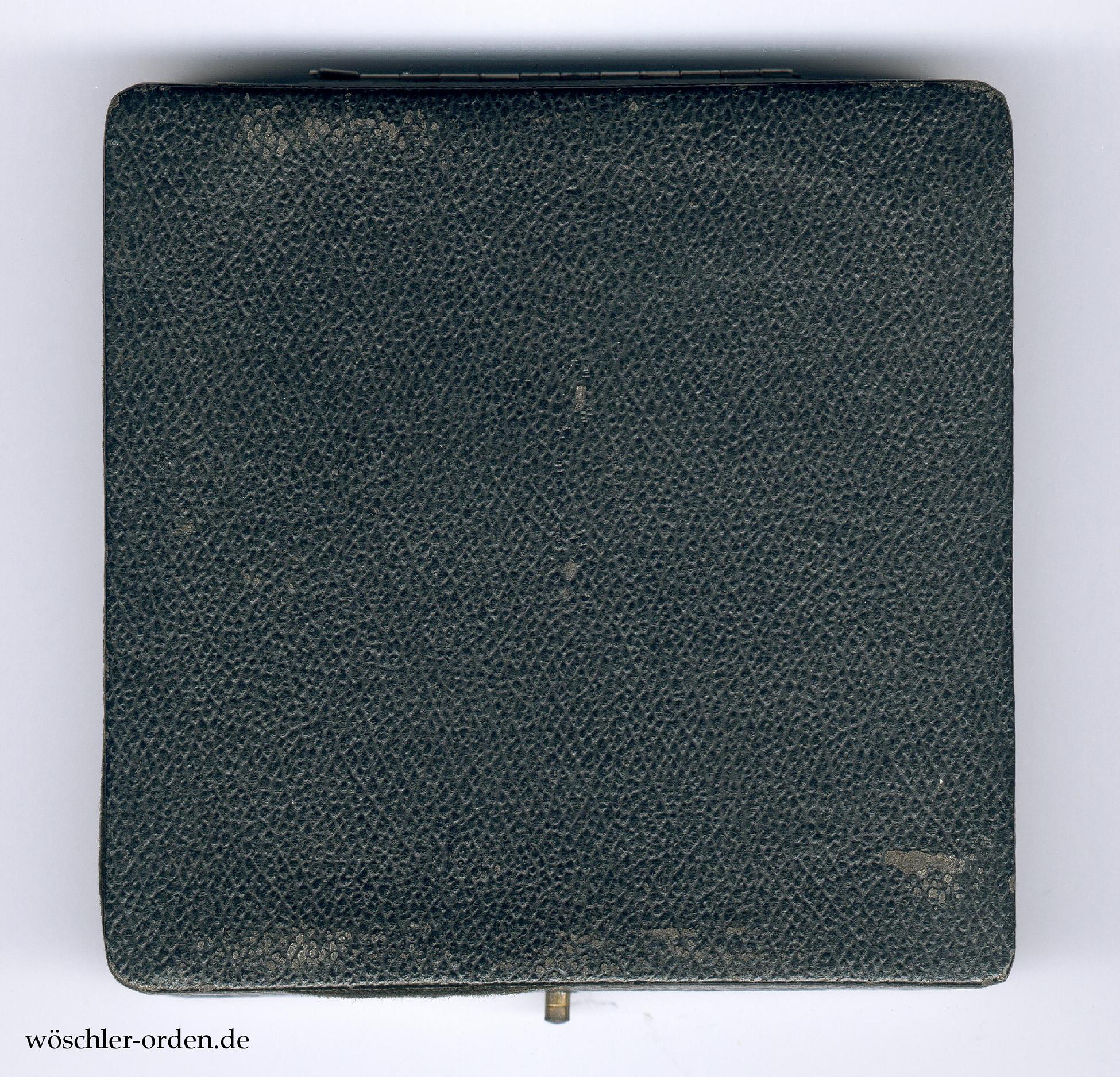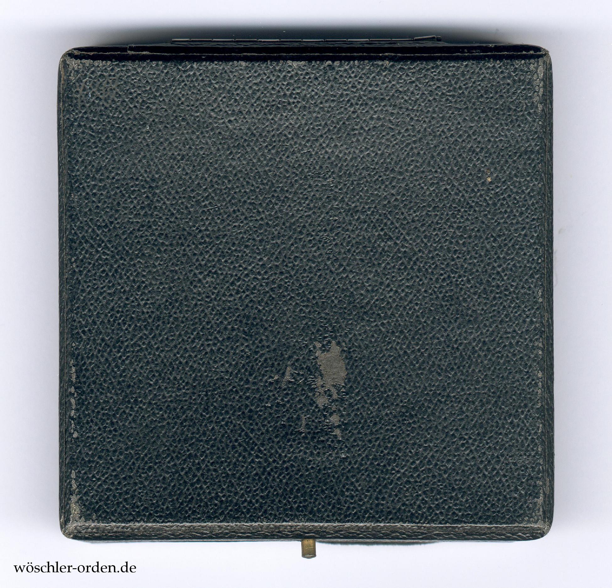 Dazu das Verleihungsetui in einer verhältnismäßig späten Ausführung, jedoch noch mit Drücker; außen mit schwarzem Lederimitat bezogen, innen eine schwarze Sprühfilzeinlage mit Aussparung für die Tragenadel; der Himmel in weißer Kunstseide, wie üblich ohne eine ersichtliche Herstellerangabe.