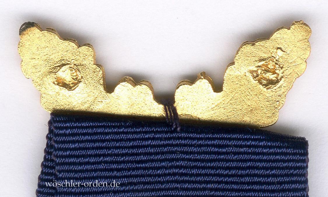 Beide Splinte fehlen! Hiervon abgesehen gute Erhaltung, mit vollständig erhaltener Vergoldung; die Dekoration auf ein schmales Bandstück aufgenäht.