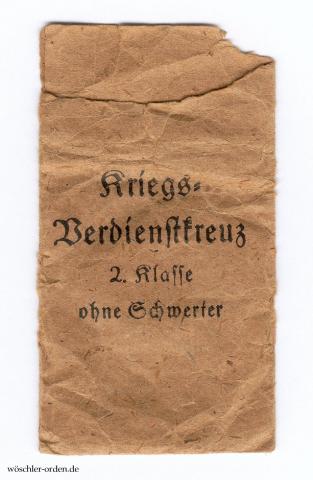 Leere Verleihungstüte („Zellstoffbeutel“), vorderseitig mit vierzeiligem Aufdruck „Kriegs- / Verdienstkreuz / 2. Klasse / ohne Schwerter“ sowie zweizeiliger Herstellerangabe „Ferdinand Hoffstätter / Bonn“ auf der Rückseite.