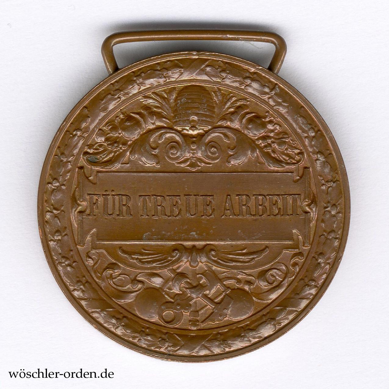 Das Ehrenzeichen „Für treue Arbeit“ wurde durch eine landesherrliche Verordnung Friedrich I. am 11. November 1895 für solche Arbeiter und männliche Dienstboten, „welche durch eine lange Reihe von Jahren in demselben Arbeits- oder Dienstverhältnis gestanden haben, unbescholten sind und pflichttreue Gesinnung gegen Uns und das Vaterland bewährt haben“, gestiftet. In der Praxis mussten mindestens 30 Arbeits- bzw. Dienstjahre, vom 25. Lebensjahr an gerechnet, erbracht werden. Mit dem Ende der Monarchie wurden die Verleihungen eingestellt. Geprägt wurden in Bronze, für beide Ausgaben zusammen, insgesamt 6050 Exemplare, in verkupfertem Eisen weitere 2100 Exemplare. Die Medaillen der zweiten Ausgabe dürften somit, entgegen weitläufiger Ansichten, die geringste Auflage haben.