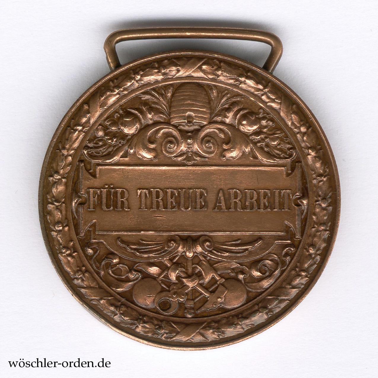Das Ehrenzeichen „Für treue Arbeit“ wurde durch eine landesherrliche Verordnung Friedrich I. am 11. November 1895 für solche Arbeiter und männliche Dienstboten, „welche durch eine lange Reihe von Jahren in demselben Arbeits- oder Dienstverhältnis gestanden haben, unbescholten sind und pflichttreue Gesinnung gegen Uns und das Vaterland bewährt haben“, gestiftet. In der Praxis mussten mindestens 30 Arbeits- bzw. Dienstjahre, vom 25. Lebensjahr an gerechnet, erbracht werden. Mit dem Ende der Monarchie wurden die Verleihungen eingestellt. Geprägt wurden in Bronze, für beide Ausgaben zusammen, insgesamt 6050 Exemplare, in verkupfertem Eisen weitere 2100 Exemplare. Die Medaillen der zweiten Ausgabe dürften somit, entgegen weitläufiger Ansichten, die geringste Auflage haben.