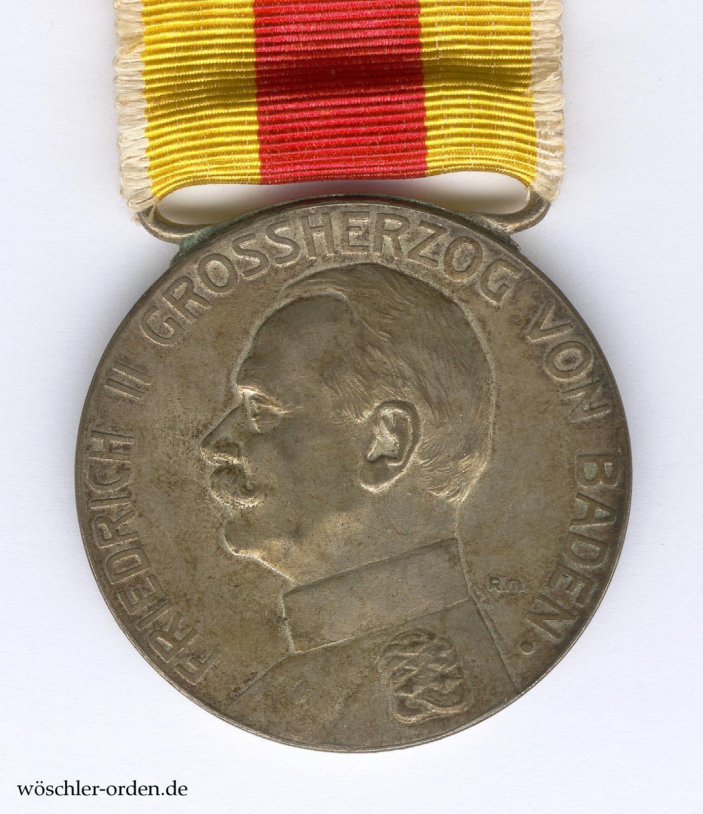 Exemplar des von 1908 bis 1918 verliehenen neunten (bei Volle: dreizehnten) Modells mit dem Portrait Großherzog Friedrich II., in der zweiten, ab etwa Juli 1916 in B. H. Mayers Hofkunstprägeanstalt, Pforzheim, geprägten Ausgabe. Eisen bzw. Stahl geprägt und versilbert, an angelötetem Tragebügel aus versilbertem Buntmetall, mit der für die „unechten“ Exemplare obligatorischen Randpunze. Das Portrait der Vorderseite schuf der Medailleur und Ziseleur Prof. Rudolf Mayer. Unter Friedrich II. sind etwa 132.350 Verleihungen der Silbernen Verdienstmedaillen nachweisbar, davon etwa 129.300 am Bande der Militärischen Karl-Friedrich-Verdienstmedaille.