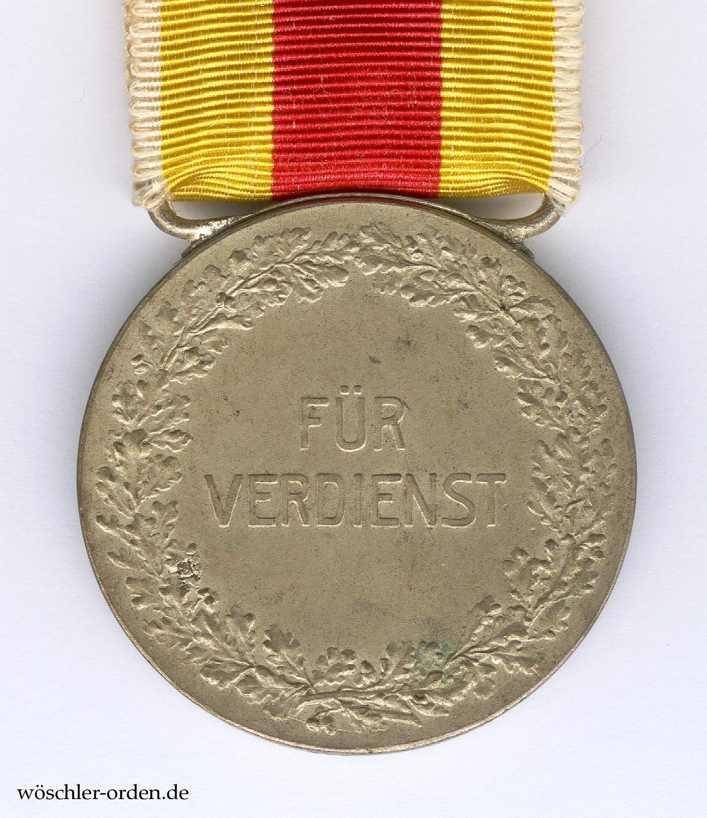 Gute, leicht getragene Erhaltung mit praktisch vollständig erhaltener, lediglich etwas ungleichmäßig patinierter Versilberung. An etwa 14 cm langem Band der Militärischen Karl-Friedrich-Verdienstmedaille.