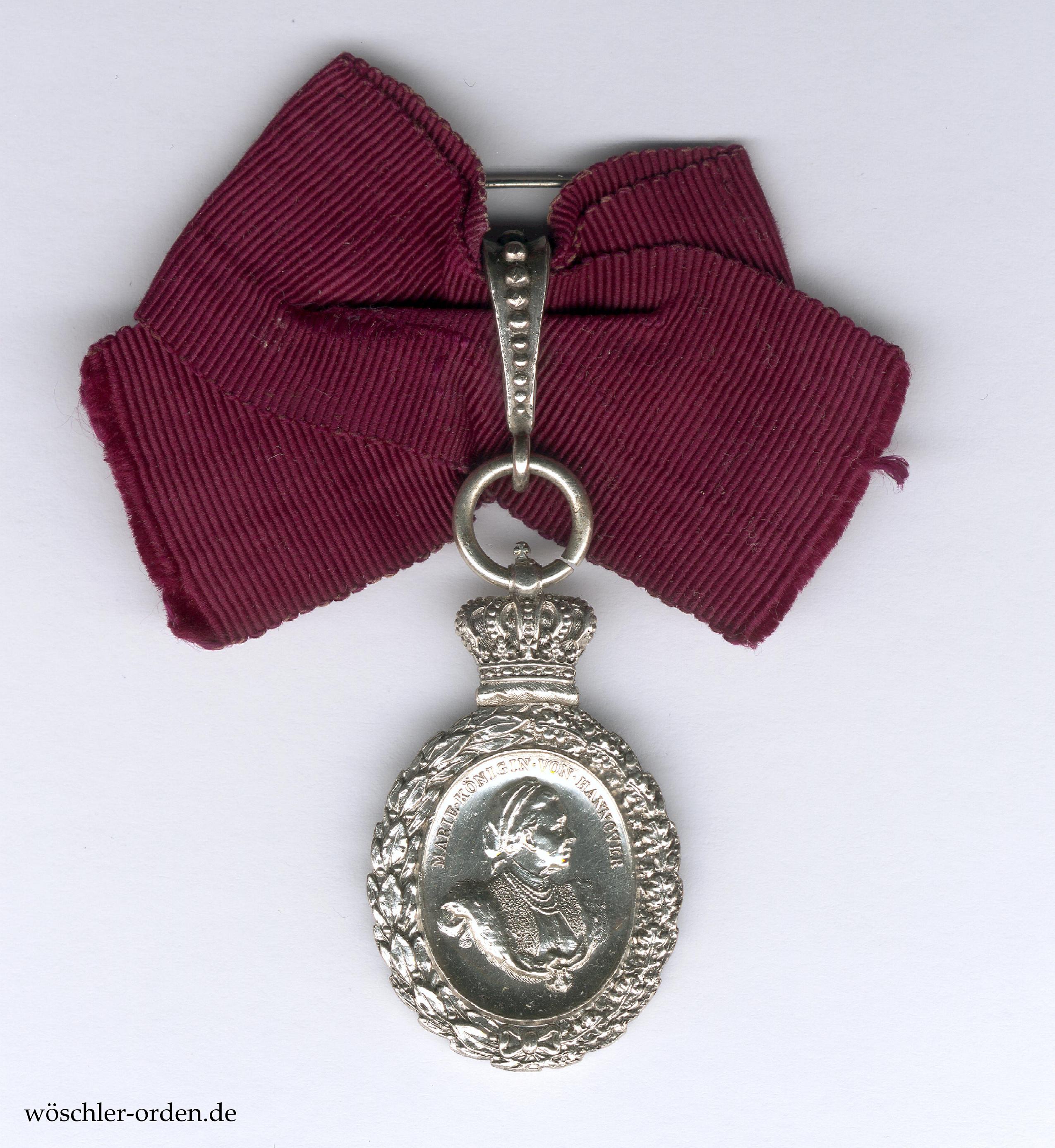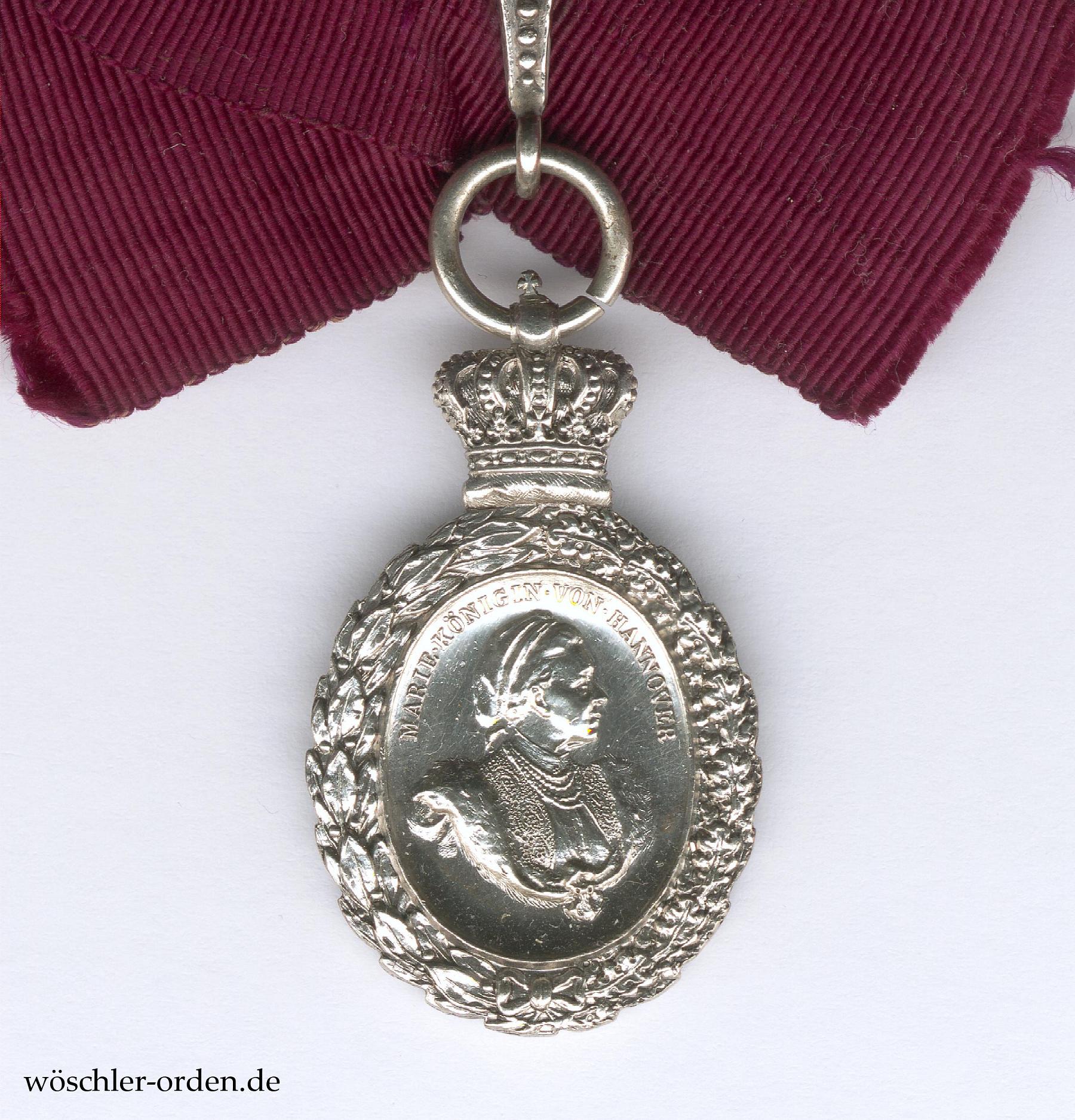 Hochovale, aus Silber massiv geprägte Medaille, von einem Kranz hälftig von Lorbeer und Eichenlaub umschlossen und von der Hannoverschen Königskrone überhöht. Exemplar der Ausgabe mit der fehlerhaften Schreibweise „MÄJESTAT“ statt „MAJESTÄT“ in der Rückseiteninschrift. Durch den Reichsapfel der Krone ein offener Bandring, dieser mit mutmaßlicher Herstellerpunzierung des K.u.K.-Kammergraveurs Jauner, Wien. An länglicher, geperlter Zieröse, daran eine dekorativ konfektionierte Damenschleife, hieran festgenäht eine einfache Sicherheitsnadel.